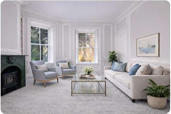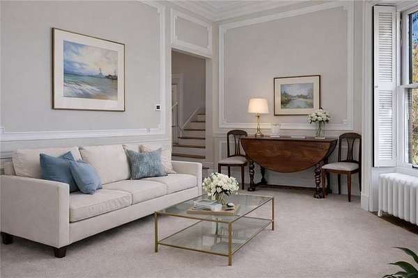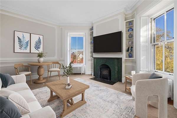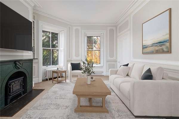 Stone mansion "Tower Unit" in the Bellevue Avenue Estate area, private park-like grounds - Lansmere Condominium - on the National Register of Historic Places - is a beautiful stone masonry mansion dating back to 1840. This two-level, 2-bedroom unit is situated in the angled corner section of the building, a shape which gives it unique charm. With its 11-12' ceilings, the living room features original classic paneled wall trim with built-in bookshelves on either side of the black marble fireplace. Large windows with leafy views of the landscape provide an abundance of natural light. Other features include an in-unit laundry, ample closet space, and extra storage in the basement. Surrounded by 2.5 acres of private park-like grounds, Lansmere is located in Newport's famed Bellevue Avenue estate area.