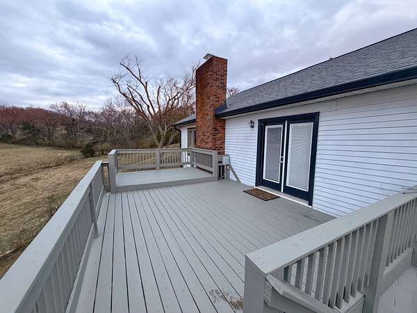 The main floor features a spacious primary bedroom, full bathroom, a bright kitchen with modern fixtures, a walk-in pantry, and an eat-at breakfast counter that opens to the dining/living area. Step out onto the large deck overlooking beautiful farmland--ideal for morning coffee, quiet evenings, or entertaining with a view.