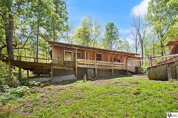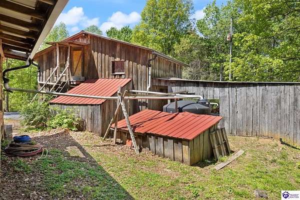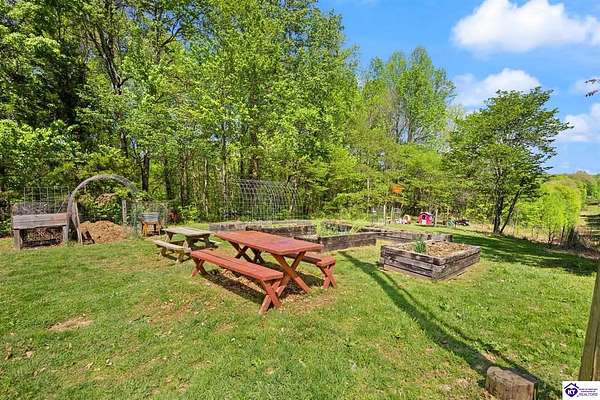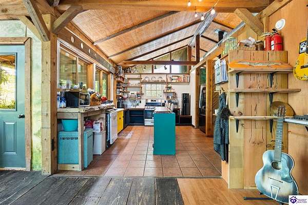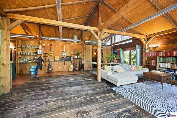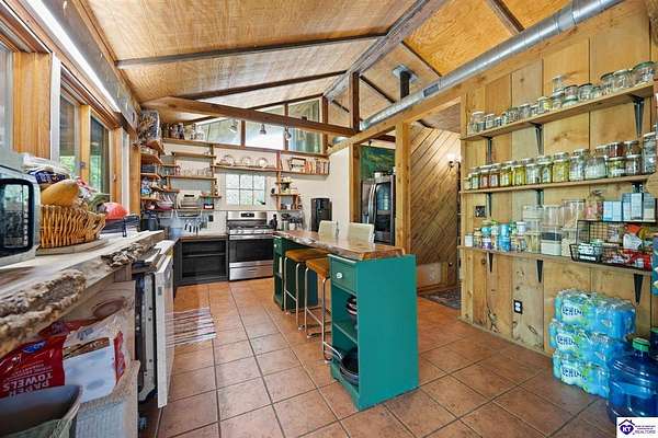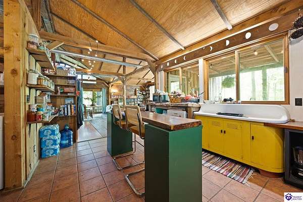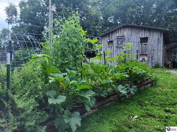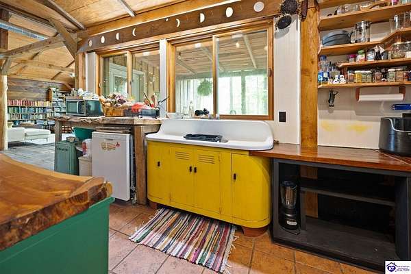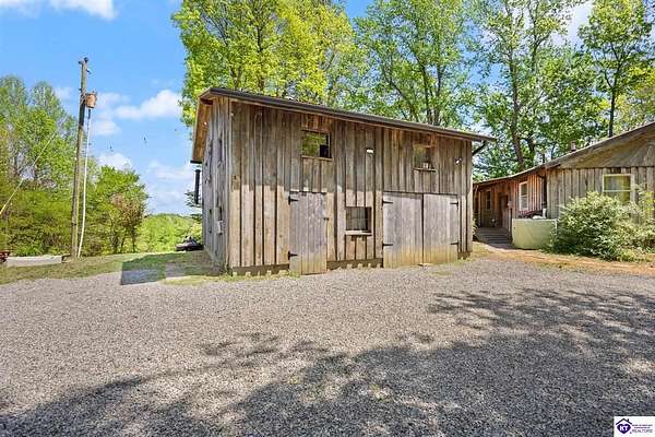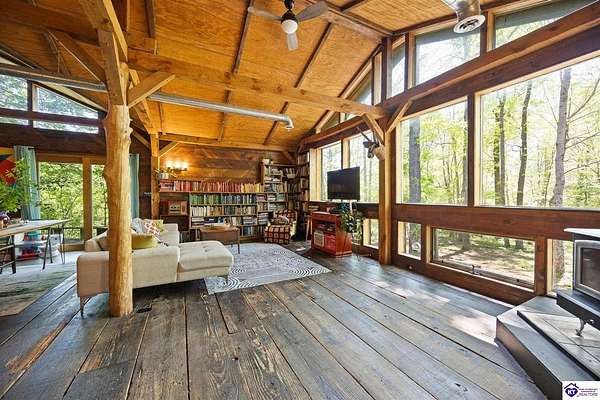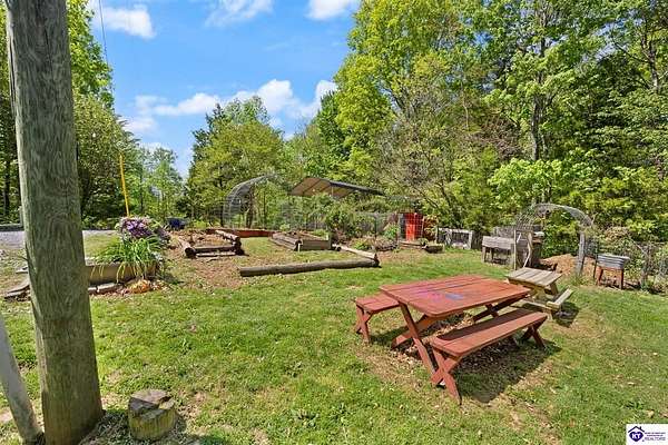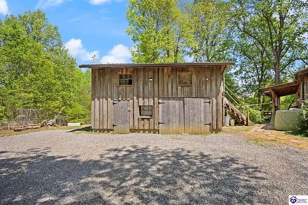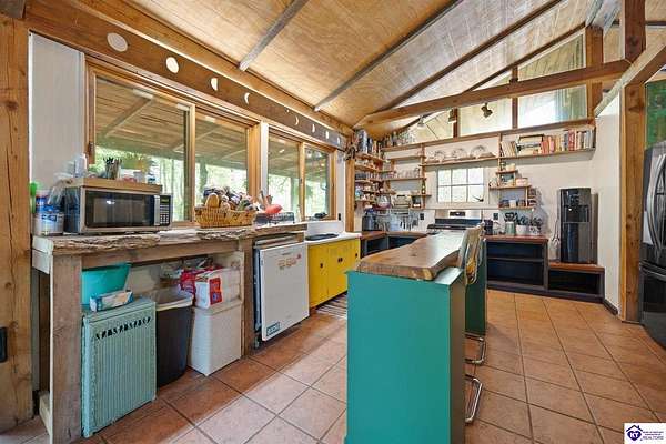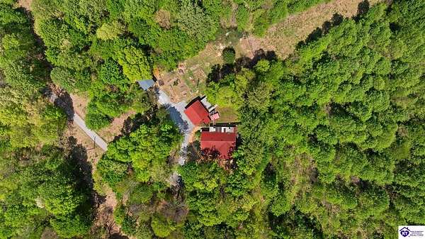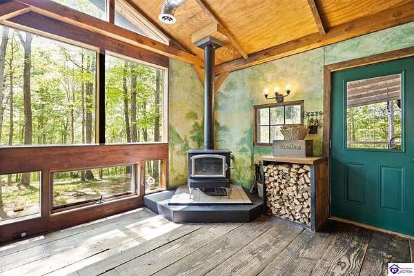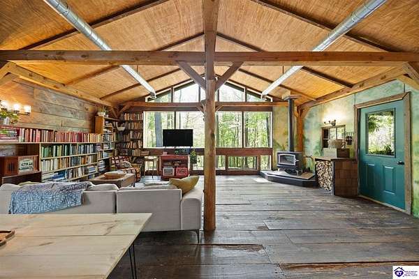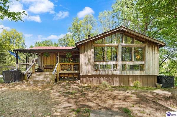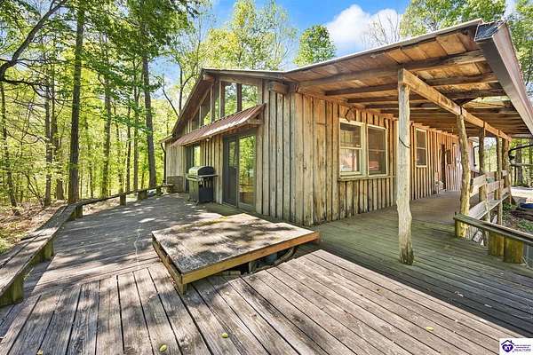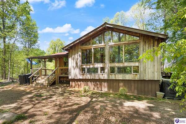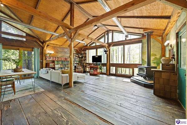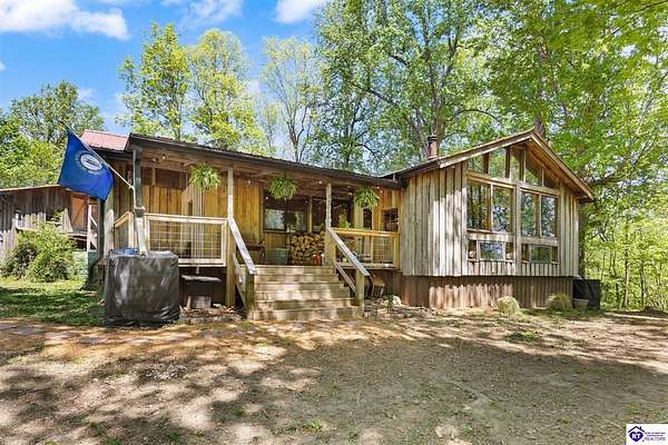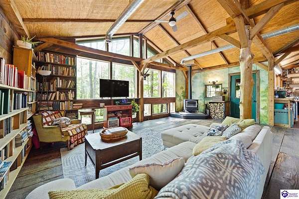 Unique Frank Lloyd Wright-Inspired Cabin on 1.9 Acres – No Restrictions! Welcome to this one-of-a-kind 1999 cabin located in Campbellsville (Marion County), offering character, functionality, and room to grow. With soaring 13-foot ceilings and a design inspired by Frank Lloyd Wright, this home blends natural beauty with thoughtful architecture. Inside, you’ll find beautiful hardwood and tile flooring throughout, along with a cozy wood-burning fireplace in the living room—perfect for relaxing evenings. All appliances remain, including the washer and dryer, making this home truly move-in ready. The home has been well cared for with only two owners, a metal roof, and the septic system pumped just three years ago. Step outside and enjoy your own mini-homestead on 1.9 unrestricted acres, featuring: Raised garden beds with compost area Fruit trees and berry bushes Plenty of space to expand or customize Need workspace or storage? This property delivers: 25x30 two-story detached garage with a wood stove and 60-amp electric. The upper level was previously used as an art studio; perfect for a creative space, office, or guest area. Plus a 15x30 double carport and a 20x20 metal carport that's 12 ft high. This home operates on a concrete cistern rainwater system, including a 1,600-gallon pump house, plus three additional 275-gallon totes for expanded capacity. Water pressure runs at approximately 60 PSI. The sellers are relocating to the city and are willing to leave their 10 hens and 4 roosters, making this a great opportunity for anyone looking to step into a homesteading lifestyle right away. If you’re looking for something truly different with space to live, create, and grow; this property is a must-see! Year built provided by owners. Conventional or Cash only.