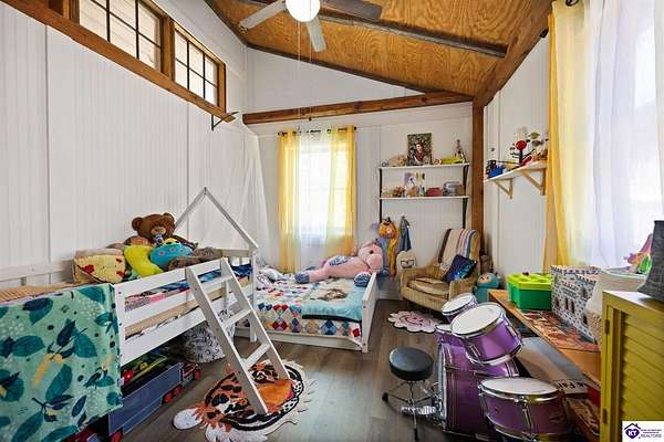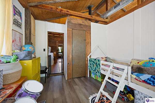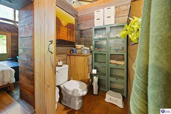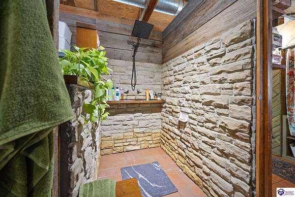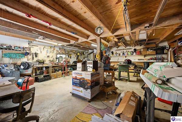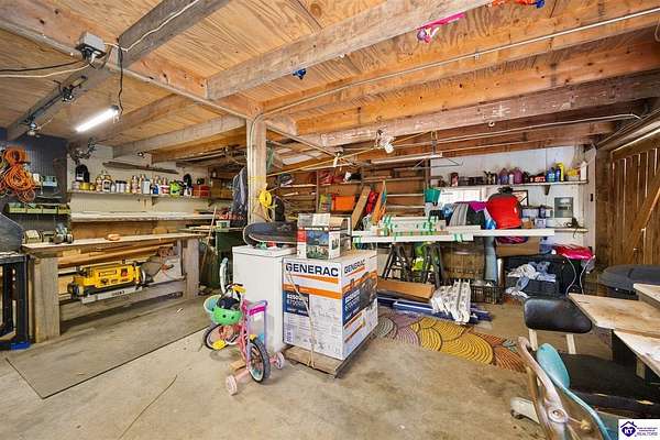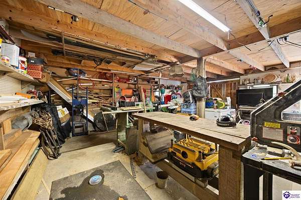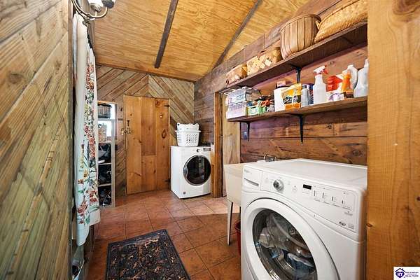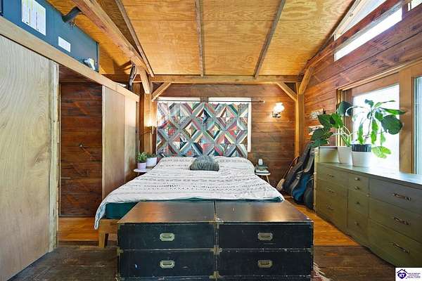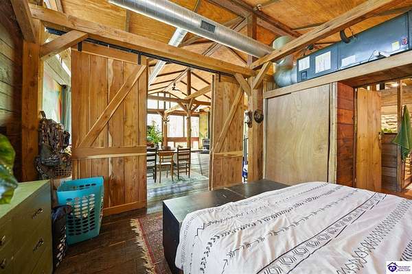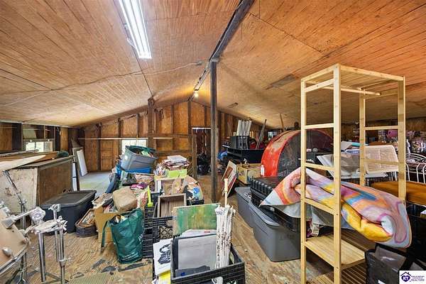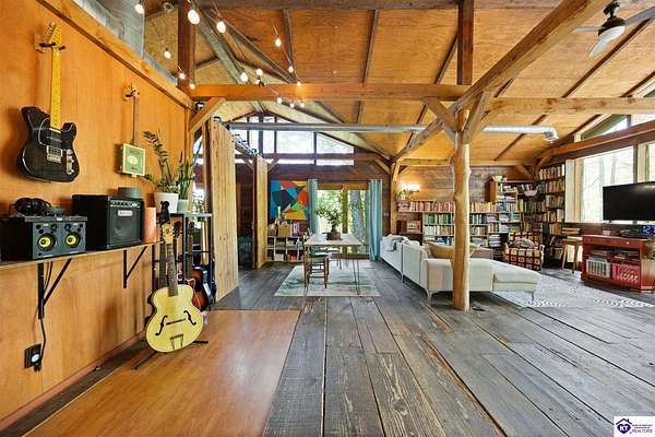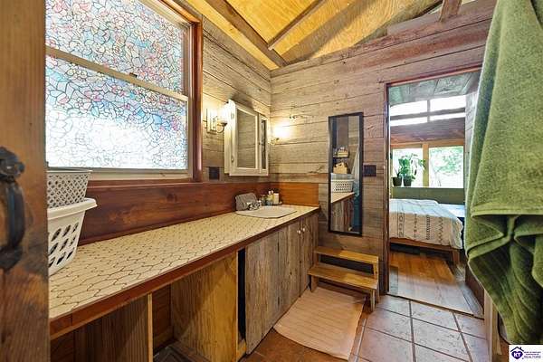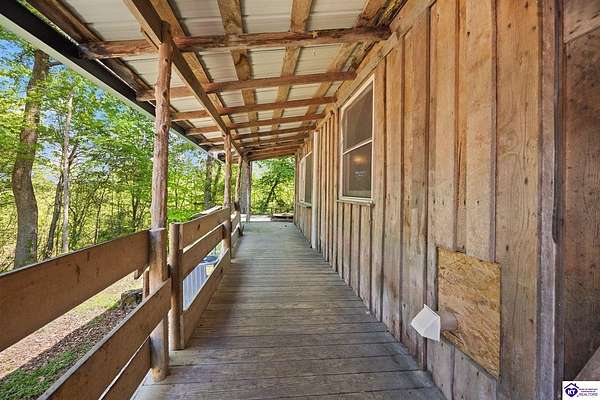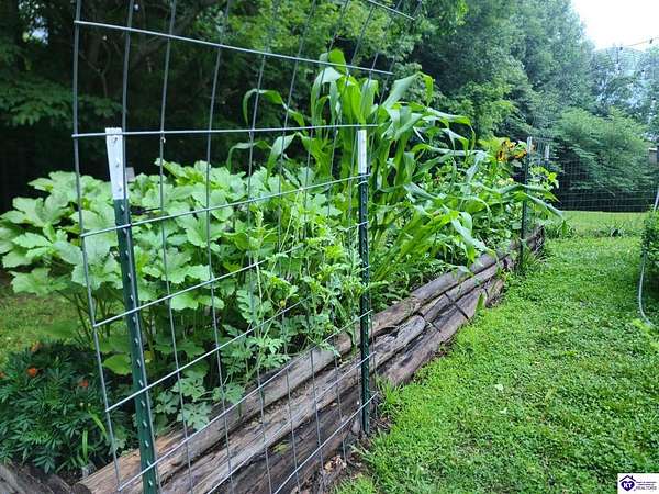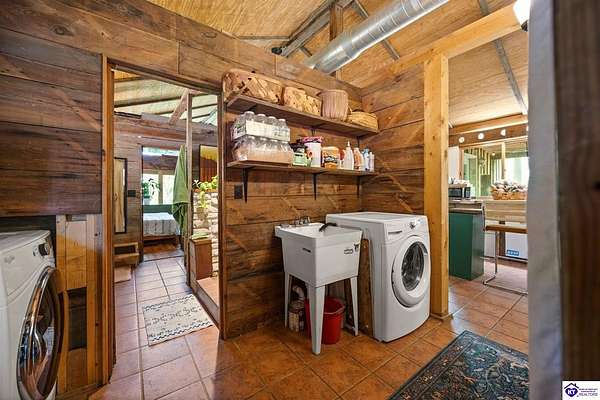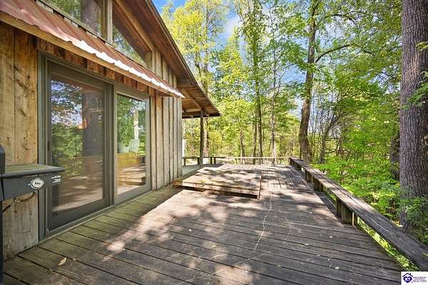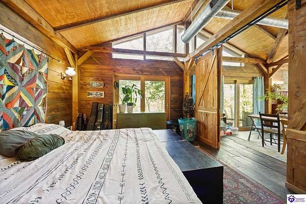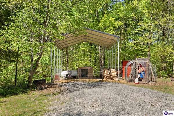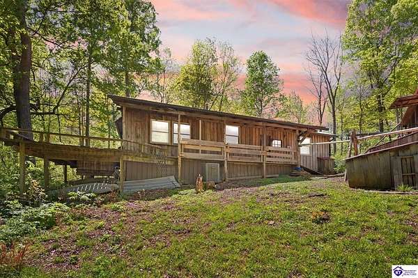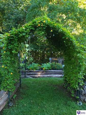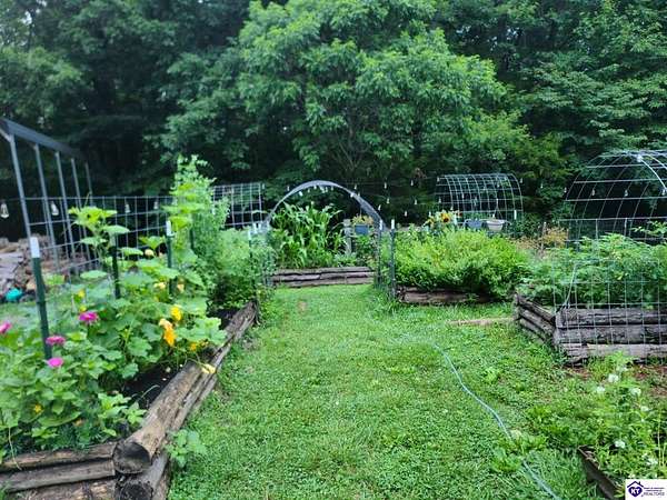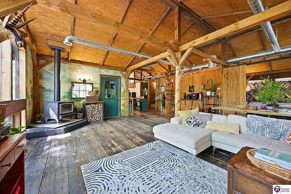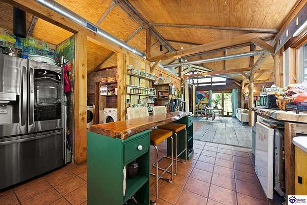 Unique Frank Lloyd Wright-Inspired Cabin on 1.9 Acres – No Restrictions! Welcome to this one-of-a-kind 1999 cabin located in Campbellsville (Marion County), offering character, functionality, and room to grow. With soaring 13-foot ceilings and a design inspired by Frank Lloyd Wright, this home blends natural beauty with thoughtful architecture. Inside, you’ll find beautiful hardwood and tile flooring throughout, along with a cozy wood-burning fireplace in the living room—perfect for relaxing evenings. All appliances remain, including the washer and dryer, making this home truly move-in ready. The home has been well cared for with only two owners, a metal roof, and the septic system pumped just three years ago. Step outside and enjoy your own mini-homestead on 1.9 unrestricted acres, featuring: Raised garden beds with compost area Fruit trees and berry bushes Plenty of space to expand or customize Need workspace or storage? This property delivers: 25x30 two-story detached garage with a wood stove and 60-amp electric. The upper level was previously used as an art studio; perfect for a creative space, office, or guest area. Plus a 15x30 double carport and a 20x20 metal carport that's 12 ft high. This home operates on a concrete cistern rainwater system, including a 1,600-gallon pump house, plus three additional 275-gallon totes for expanded capacity. Water pressure runs at approximately 60 PSI. The sellers are relocating to the city and are willing to leave their 10 hens and 4 roosters, making this a great opportunity for anyone looking to step into a homesteading lifestyle right away. If you’re looking for something truly different with space to live, create, and grow; this property is a must-see! Year built provided by owners. Conventional or Cash only.