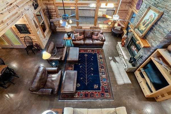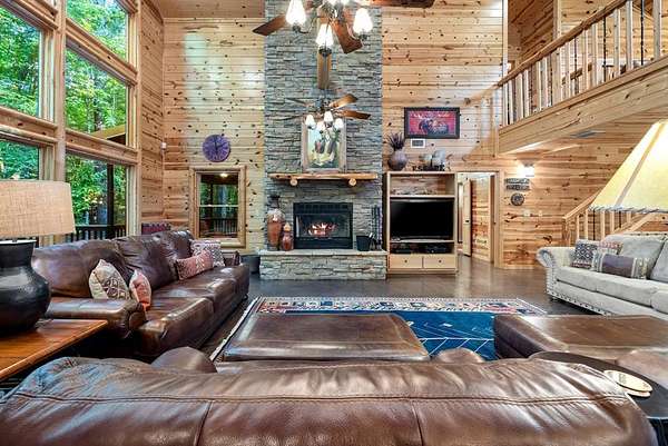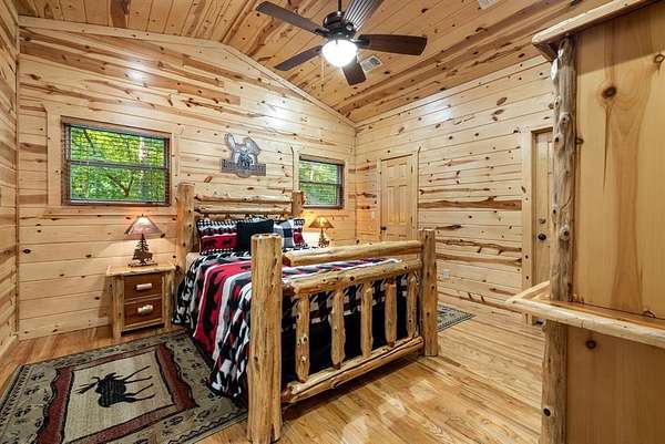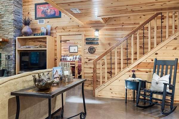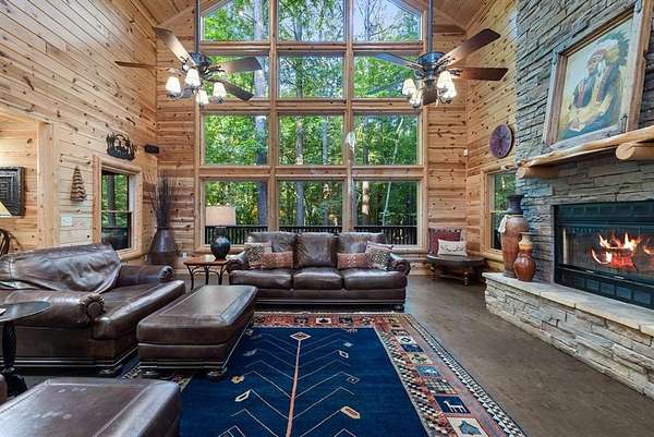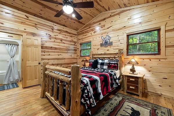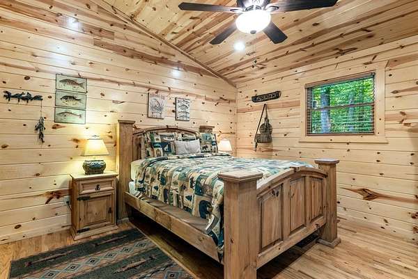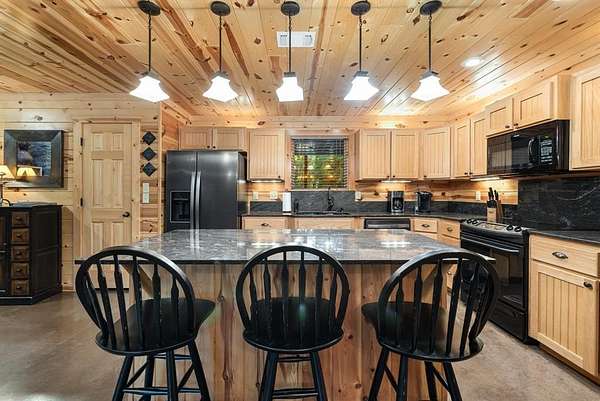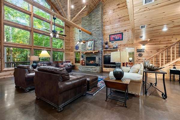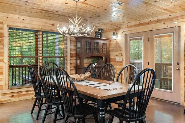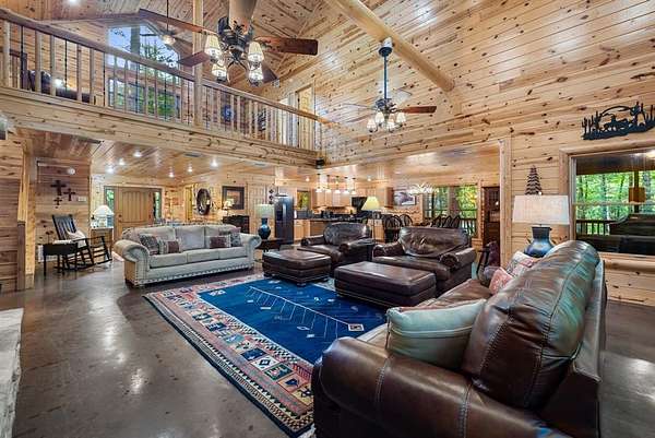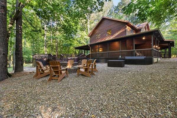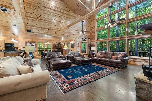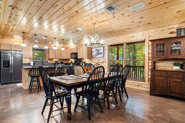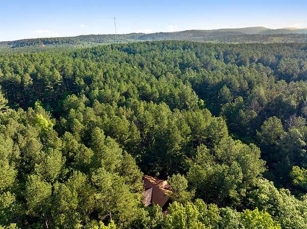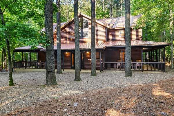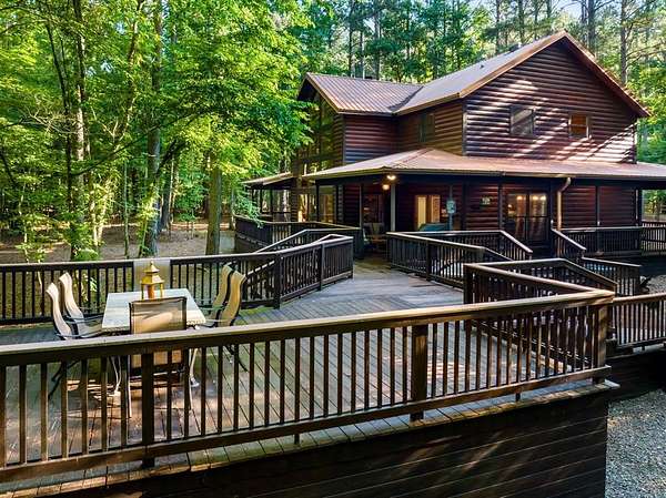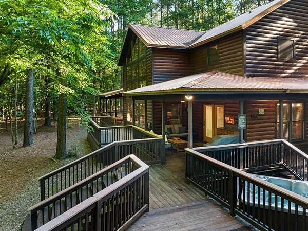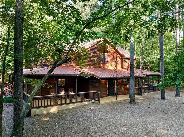This real log cabin would be a perfect full-time residence, second home, or short-term rental, located on approximately two acres of densely wooded, tall pine trees and on a year-round creek, backing the National Forest. Suburb location in the heart of Hochatown, but far enough off the highway, the only thing you will hear is the 80-foot-tall trees swaying in the wind. This short-term rental is in a fabulous setting, and privacy and rustic charm abound at Pine Creek Lodge. This cabin is a real log cabin with impressive construction. As you enter the cabin, the great room has stained concrete floors, a stacked stone fireplace, a vaulted, beamed ceiling, and warm pine interiors. The spacious open floor plan combines the living room, kitchen, and dining room, with sky-high ceilings and glass from floor to ceiling. The kitchen has been updated with granite countertops, black appliances, and a breakfast bar. Upstairs, you will find the gaming loft. The bathrooms have also been updated with tile countertops, copper sinks, and updated showers. But the best part of this cabin may be the expansive outdoor spaces, as you can wander into the National Forest! Just outside the glass is a bird's eye view of the thick pine forest - a perfect place for bird watching while sinking back into a comfortable couch. Or you can gaze at the flames of the 2-story stacked rock wood-burning fireplace while listening to music on the surround sound oversized flat screen satellite TV. A short drive to Broken Bow Lake, the Mountain Fork River, and Beavers Bend State Park. There's so much to do around the area, whether it's zip-lining, axe-throwing, horseback riding, making your own wine and label at Girls Gone Wine, and much more! You can hike right behind the cabin, or bring 4-wheelers for the many National Forest trails. TAKE A TOUR BY VIEWING THE WALKTHROUGH VIDEO. For a video link, contact the Listing Agent