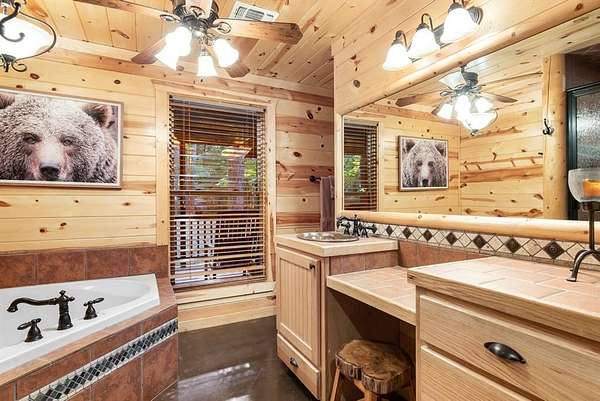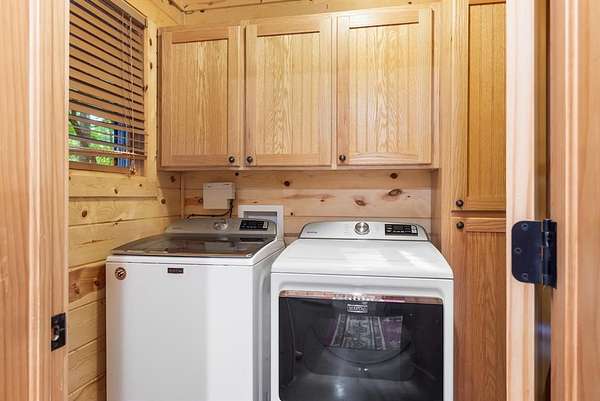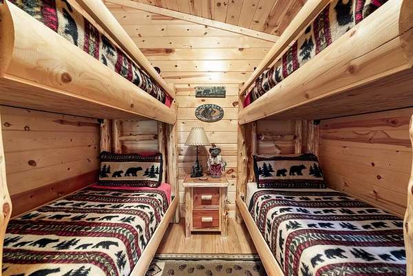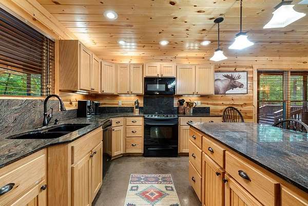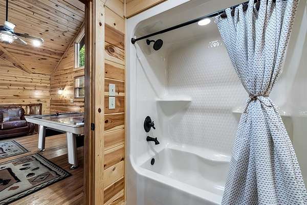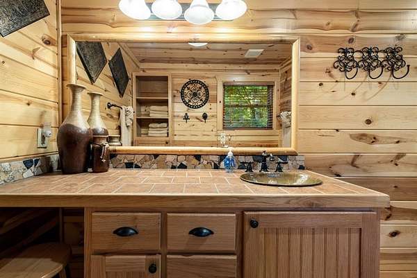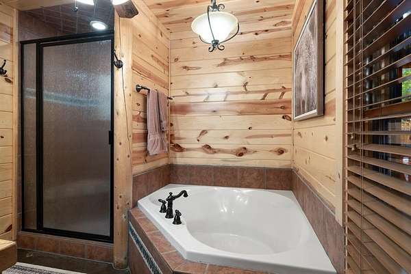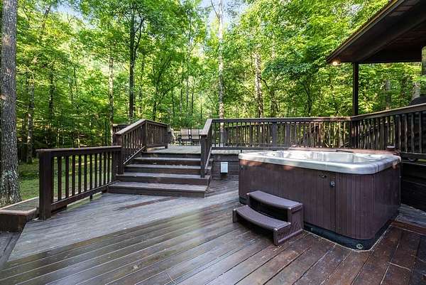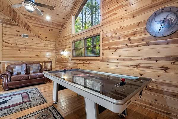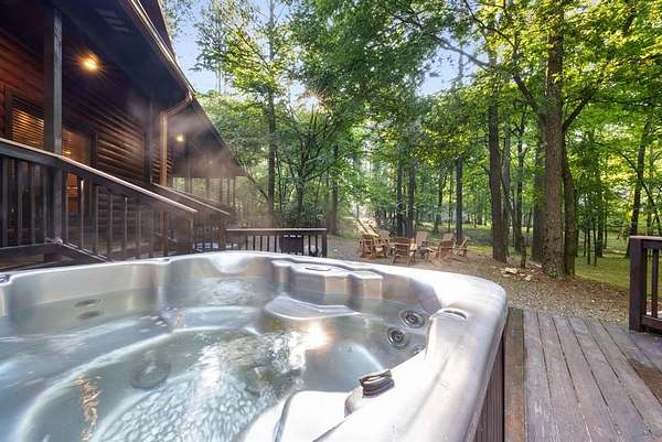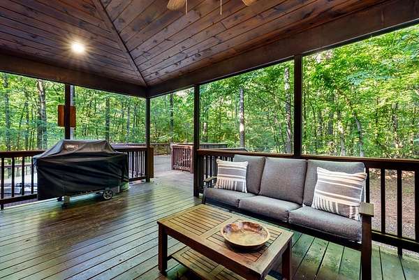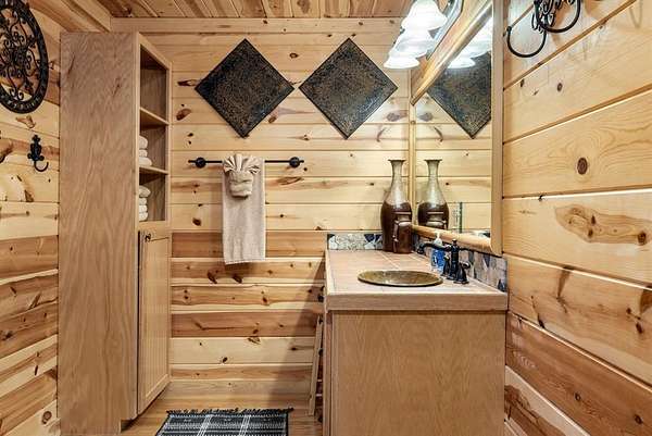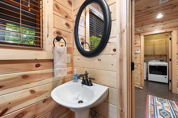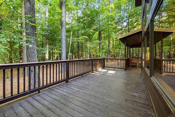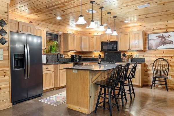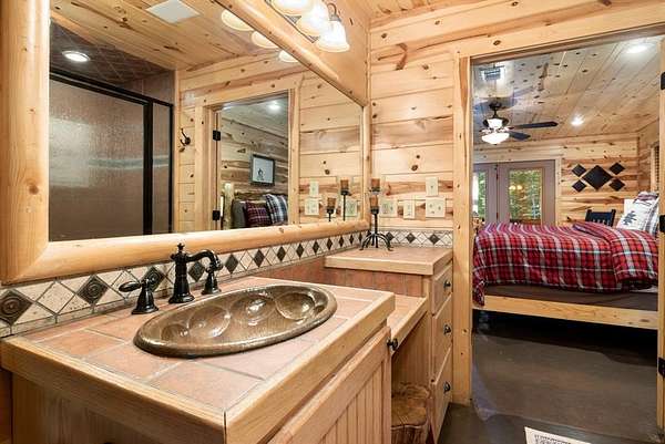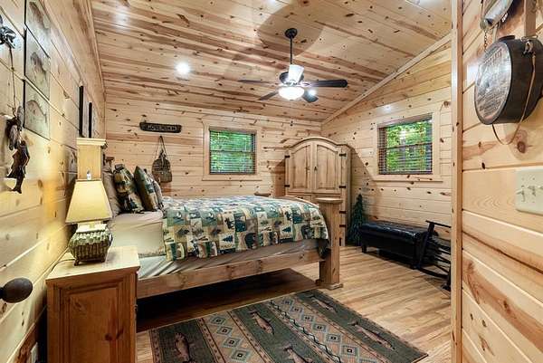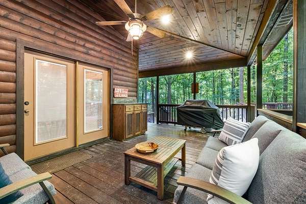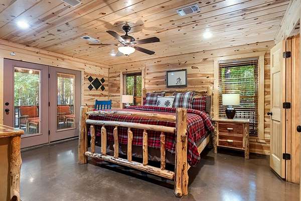 This real log cabin would be a perfect full-time residence, second home, or short-term rental, located on approximately two acres of densely wooded, tall pine trees and on a year-round creek, backing the National Forest. Suburb location in the heart of Hochatown, but far enough off the highway, the only thing you will hear is the 80-foot-tall trees swaying in the wind. This short-term rental is in a fabulous setting, and privacy and rustic charm abound at Pine Creek Lodge. This cabin is a real log cabin with impressive construction. As you enter the cabin, the great room has stained concrete floors, a stacked stone fireplace, a vaulted, beamed ceiling, and warm pine interiors. The spacious open floor plan combines the living room, kitchen, and dining room, with sky-high ceilings and glass from floor to ceiling. The kitchen has been updated with granite countertops, black appliances, and a breakfast bar. Upstairs, you will find the gaming loft. The bathrooms have also been updated with tile countertops, copper sinks, and updated showers. But the best part of this cabin may be the expansive outdoor spaces, as you can wander into the National Forest! Just outside the glass is a bird's eye view of the thick pine forest - a perfect place for bird watching while sinking back into a comfortable couch. Or you can gaze at the flames of the 2-story stacked rock wood-burning fireplace while listening to music on the surround sound oversized flat screen satellite TV. A short drive to Broken Bow Lake, the Mountain Fork River, and Beavers Bend State Park. There's so much to do around the area, whether it's zip-lining, axe-throwing, horseback riding, making your own wine and label at Girls Gone Wine, and much more! You can hike right behind the cabin, or bring 4-wheelers for the many National Forest trails. TAKE A TOUR BY VIEWING THE WALKTHROUGH VIDEO. For a video link, contact the Listing Agent