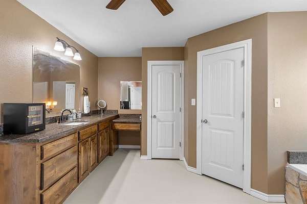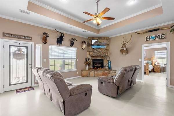 Inside, a spacious open layout connects the living room, anchored by a stone fireplace, with a chef-friendly kitchen featuring rich cabinetry, granite countertops, and an oversized island for gathering. Natural light floods the home, highlighting the craftsmanship and offering serene views of the surrounding property. The primary suite feels like a private getaway with tray ceilings, dual vanities, a soaking tub, and a walk-in shower.