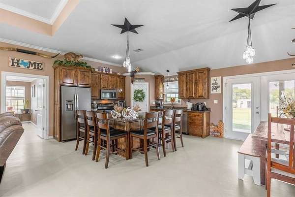 Outdoors, the possibilities are limitless--whether it's ranching, recreation, or simply savoring peaceful country sunsets. A massive metal shop and covered parking expand both functionality and storage. With prime road frontage and acreage ready for your vision, this property delivers the space, freedom, and opportunity that few others can match.
