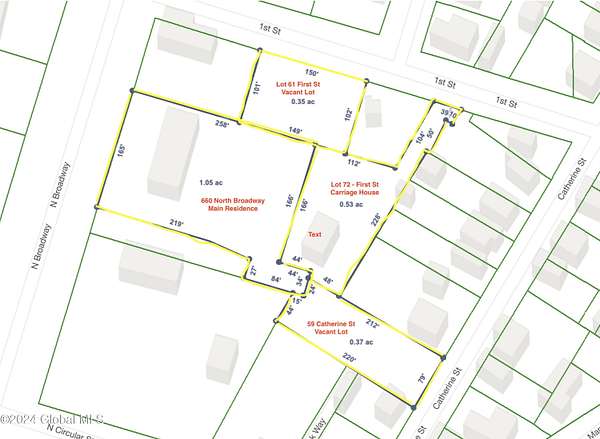 An exceptional opportunity for astute Buyers on North Broadway in Saratoga Springs; a sprawling 2.28-acre property hosting two homes mere steps away from downtown. Comprised of four parcels - the Main House, a Carriage House on L72 First St (165.36-72), a vacant lot on L61 First St (165.36-2-61), and 59 Catherine St (165.36-2-47) - this offering invites you to shape your private haven or fashion a multi-generational estate in Saratoga Springs' best neighborhood. Whether you are drawn to the existing charm or envision a transformative renovation, the property's expansive size and incredible location create a rare combination allowing Buyer's to flex their creative muscles in this premier location.