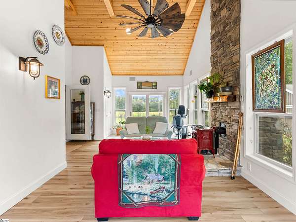 Call The Clayton Group with Real Broker at 864-895-8977. Tucked away at the end of a 1,250-foot driveway, this peaceful and private property offers the best of rural living--plenty of space, stunning natural surroundings, and complete seclusion, all just a short walk to the South Carolina line. Although the address is Rutherfordton, the home is located in desirable Polk County and offers a fantastic opportunity for a horse property, mini farm, or simply a quiet country retreat. The land includes open pasture areas, woods, and a garden space with raised beds, all partially fenced and ready for animals or expansion. Two tax maps included, and the other parcel has frontage on Radar Road. The property includes a 24x24 barn-style garage with power, front and rear sliding doors, and dual 24x15 lean-tos on each side, offering flexible space for animals or equipment. There's also a 32x30 equipment or hay storage building with over 11-foot ceilings. Inside, the home is full of charm and light, featuring hickory hardwood floors throughout most of the living spaces and no carpet. The kitchen is well-appointed with solid hickory cabinetry, Corian countertops, a center island, pantry, and a full suite of appliances--including the washer and dryer. A spacious eat-in area and plenty of windows make the heart of the home feel bright and inviting. One of the highlights is the beautiful sunroom addition with vaulted wood-lined ceilings, luxury vinyl plank flooring, and a Vermont Castings Defiant wood stove with a floor-to-ceiling stone surround. This space is served by a mini-split system and opens onto a stone patio where a private hot tub awaits--also included with the home. The primary suite is tucked away at the back of the house and features a walk-in closet, tiled shower, jetted tub, dual vanities, and lots of natural light. All bedrooms are located off a central hallway and offer generous closet space. The home also features nine-foot ceilings, crown molding, and a full-length covered front porch perfect for relaxing while taking in the pastoral views. With internet access available, room to roam, and no other homes in sight, this property offers a rare combination of comfort, privacy, and flexibility. Whether you're looking to start a small farm, keep horses, or simply enjoy the peaceful lifestyle, this one is truly special.Home can also be purchased for $689,900 with 13.99 acres.