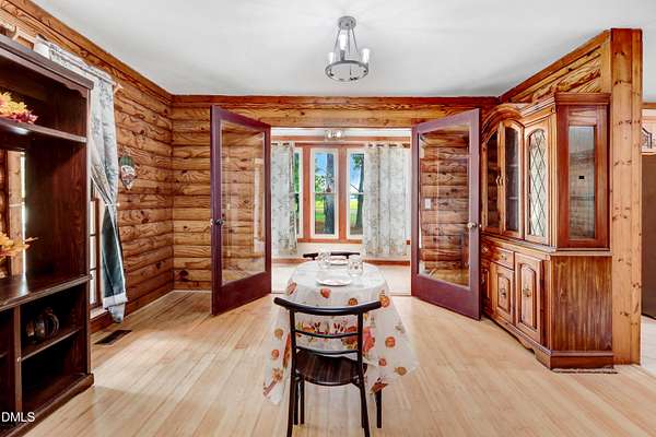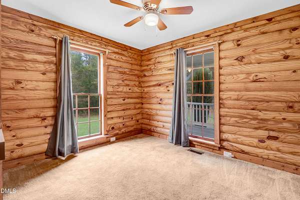 Welcome to this charming log home nestled on a serene 2.56-acre cul-de-sac lot with beautifully landscaped surroundings. Step onto the large rocking chair front porch and enjoy the peaceful ambiance of country living. Inside, you'll find fresh paint throughout, a stunning new tile backsplash in the kitchen, warm butcher block countertops, and beamed ceilings in the cozy living room that add timeless character. The home is filled with natural light, enhanced by thoughtfully placed skylights. The remodeled master bath boasts a large tile shower and updated counters, while the guest bath has been tastefully remodeled. The flooring includes rich bamboo in the dining, living, and hallway areas, plush carpet in the bedrooms, and durable tile in the sunroom, kitchen, laundry, entryway, and screened back porch - perfect for that peaceful morning coffee. Additional features include a detached 1 car garage/workshop, carport, and plenty of space to enjoy outdoor living. This home is a true hidden gem offering warmth, charm, and functionality all in one. 1 year home warranty! Preferred Lender can offer special financing with lender credits... ask today!