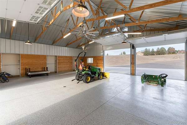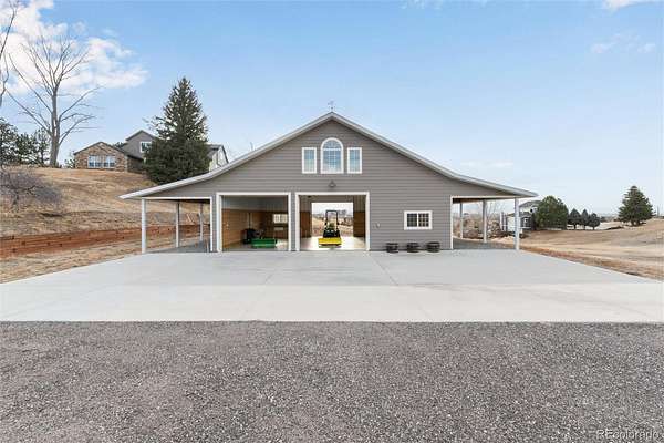 Once-in-a-generation opportunity in the exclusive 48-home Sierra Vista community. Updated 4,542 SqFt mountain contemporary estate sits on 4.92 acres and has a 6’ Fence in backyard for your furry friends. Breathtaking panoramic views of the Front Range, City skyline, Meadows, and Open Plains. Horse property, RV parking, and possible multi-generational living all under one roof. The open floor plan impresses with vaulted ceilings, hardwood floors, granite countertops, two fireplaces, and a chef's kitchen featuring stainless steel appliances, large island, breakfast nook, and walk-in pantry. The main floor primary suite offers a fully remodeled 5-piece bath with soaking tub, dual vanity, oversized shower, and his-and-her walk-in closets. Upper level hosts two spacious secondary bedrooms, Jack and Jill bath, and a flexible loft with sink and refrigerator perfect for a home office. The finished walkout basement delivers 1,381 SqFt Finished of bonus living space including a great room with fireplace, full wet bar with dishwasher and refrigerator, steam shower, gym or 4th bedroom with closet. Including Outdoor access, workshop and a true mother-in-law suite potential. Outside, a $300K investment awaits: a 1,512 SqFt permitted custom barn built 2019 with epoxy floors, 3 stalls, RV parking, water, and electrical. Add a 3-car attached garage with 220V, expansive Trex deck, included hot tub, wraparound porch, dog run, and irrigated landscaping framing every sunset. Minutes to C-470. DIA in 25 min. Park Meadows in 10. Top-rated Douglas County Schools. 4 Bed | 4 Bath | 4,887 Total SqFt | Acreage | Septic | Community Well | Livestock Eligible | Low $500/YEAR HOA.