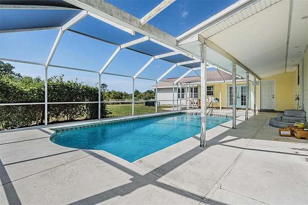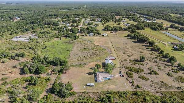 One or more photo(s) has been virtually staged. 7+ ACRES AT THE END OF A QUIET COUNTRY ROAD — FULLY FENCED, HIGH & DRY, AND READY FOR LIVESTOCK, EQUIPMENT, AND TRUE COUNTRY LIVING WITH BARN, WORKSHOP, CANOPY, POOL & FULL IN-LAW SUITE | Tucked away at the end of a quiet rural road, this fully fenced 7.2-acre property offers exceptional privacy, functionality, and peace of mind. Featuring two gated entrances and a country setting with no flood concerns, this property is ideal for those seeking space, security, and a true country lifestyle. Zoned for agricultural use, the land is perfect for horses, cows, and other livestock, with plenty of open space for grazing, recreation, or future expansion. The main home offers 3 bedrooms and 2.5 bathrooms with a split floor plan, featuring a private primary suite on one side of the home and two additional bedrooms with a full bath on the opposite side. The layout includes a spacious living and dining area, a separate kitchen, and a cozy wood-burning fireplace, with exposed beams adding character throughout. Just off the screened pool and lanai, you’ll find a convenient half bath, perfect for guests and outdoor entertaining. An attached in-law suite provides excellent flexibility and privacy, complete with its own bedroom, full bathroom, large living area, and full kitchen. With a private entrance off the lanai and its own A/C system, this space is ideal for extended family, guests, or potential rental use. A utility/laundry room connects the main home and in-law suite for added convenience. Outside is where this property truly stands out. A 22x30 metal pole barn offers substantial covered space for equipment, vehicles, or agricultural use. A 40x60 covered canopy is ideal for parking RVs, boats, farm equipment, or recreational vehicles, while another shed situated behind the home makes for additional workspace and storage. The expansive acreage is both functional and enjoyable—perfect for horses, livestock, storage, or outdoor recreation. With room to ride ATVs, dirt bikes, or simply enjoy the outdoors, this property offers a level of freedom that’s very hard to find. Enjoy Florida living with a screen-enclosed in-ground pool and a full-length covered front porch overlooking the peaceful surroundings and mature trees. With no HOA, agricultural zoning, gated access, dual A/C systems, a roof replaced in 2021, a 160’ well, and a whole-home water filtration system, this property offers a rare opportunity to own usable acreage with flexibility and long-term potential. Schedule your private showing today!