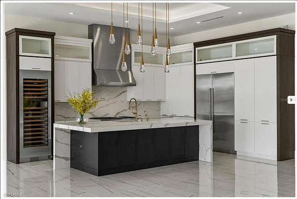 Dramatic sightlines from the grand entry sweep through sun-drenched principal rooms to the resort-caliber outdoor living spaces beyond. The showstopping gourmet kitchen dazzles with extra-thick natural quartzite countertops, an oversized center island, pot filler, a fully integrated refrigerator and dishwasher with bespoke wood-panel cabinetry, and an oversized walk-in pantry — a culinary stage worthy of the most discerning chef. A soaring great room with designer tray ceilings and an elegant formal dining room set the scene for unforgettable entertaining, complemented by a private study and home office.