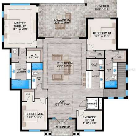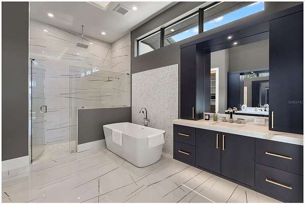 The first-floor primary suite is a true sanctuary — a sumptuous walk-in closet, sculptural freestanding soaking tub, and a spa-inspired shower enclosure deliver five-star hotel indulgence at home. Upstairs, a second master suite, a spectacular lake-view recreation room with oversized balcony, three additional bedrooms, a chic loft with front balcony, and a second laundry suite elevate every aspect of daily life.