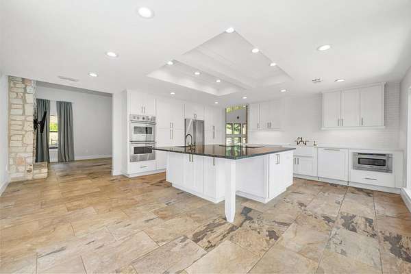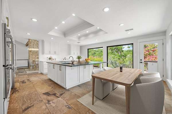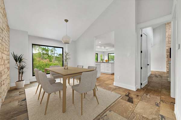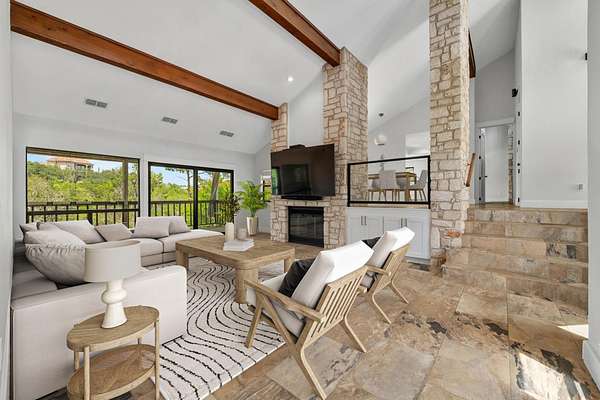Set on over 3 acres with panoramic Hill Country views, this beautifully updated Long Canyon home offers a rare blend of privacy, thoughtful design, and natural beauty. The flexible floor plan features three living areas, two dining spaces, and a spacious kitchen with custom cabinetry, Viking appliances, and an oversized island. Large picture windows in the kitchen and dining areas frame expansive views and fill the home with natural light, creating an ideal setting for both everyday living and entertaining. The main living room offers a warm and inviting space accented by exposed beams, stone details, and direct access to outdoor decks that capture the home's hilltop setting. The private primary suite includes a spa-like bath and two walk-in closets-one thoughtfully expanded from a former en-suite space. Two additional bedrooms and a dedicated office or flex space provide comfort and versatility for guests, work, or hobbies. Multiple outdoor living areas-including covered decks and open patios-invite you to enjoy quiet mornings and golden-hour sunsets from every angle. Located in the desirable Long Canyon neighborhood, this home offers the peace of Hill Country living with convenient access to Loop 360, FM 2222, and Central Austin.