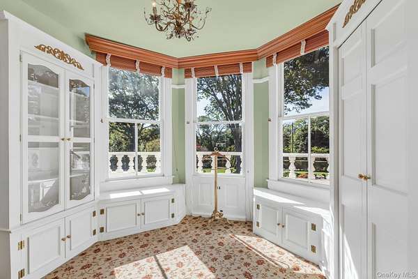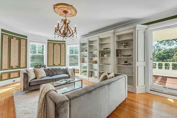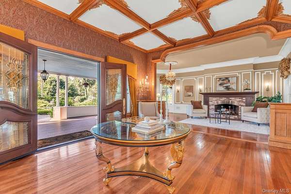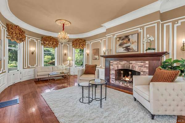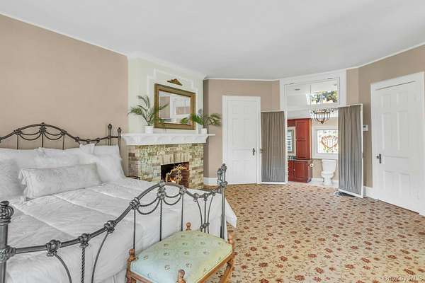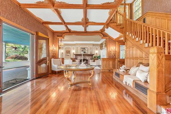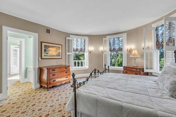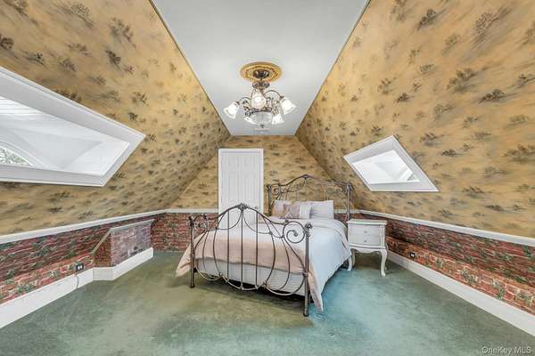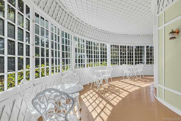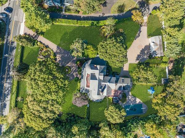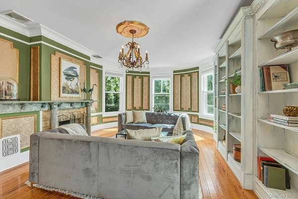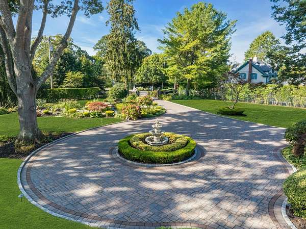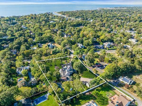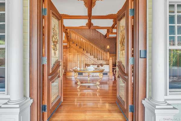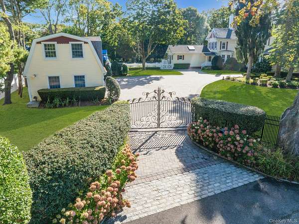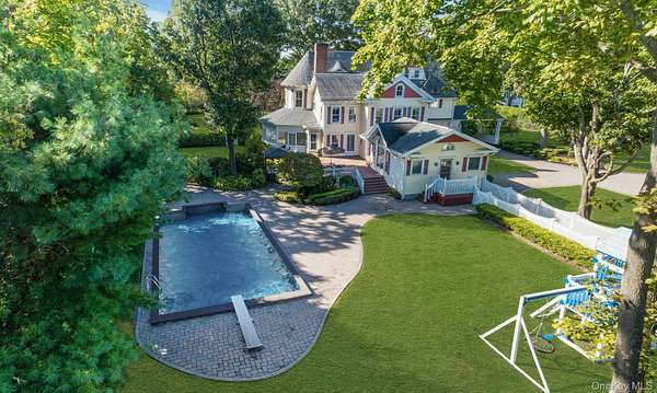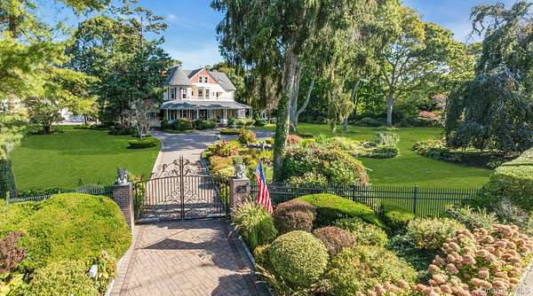 Step beyond the wrought-iron gates and into Towering Pines, a remarkable 1860 Queen Anne Victorian where timeless architecture meets a storybook setting. Perfectly situated in South Bayport, this distinguished residence unfolds across lush, professionally landscaped grounds reminiscent of a private arboretum, where mature specimen trees, vibrant gardens, and curated pathways create an atmosphere of serenity and grace.The property's exterior is a sanctuary of outdoor living--featuring a tranquil koi pond with waterfall, an in ground pool surrounded by flowering gardens, a pergola-covered fire pit area, a child's play space, a covered hot tub, and a dedicated dog run. A circular driveway with a central fountain, porte-cochere, and motor court lead to a detached three-car garage crowned by an inviting bonus loft, ideal for studio use, or private retreat. The home's wraparound porch--one of its most defining features--welcomes you to a residence where craftsmanship and character reign supreme. Through double doors, the grand oak-paneled foyer sets the tone for what's within: hand-carved woodwork, coffered ceilings, crystal sconces, and built-in seating that speaks to the home's heritage and grace. Flanked by a formal living room and dining room, each with its own fireplace, this level showcases extraordinary architectural detail. The living room's curved windows open fully to the porch, while the dining room's raised panel walls and French doors connect seamlessly to the solarium and garden beyond. The handsome study, with its built-in granite-topped desk and intricate millwork, offers the perfect space for working from home in style. The kitchen is a blend of form and function, offering custom cabinetry, granite surfaces, and chef-caliber appliances, flowing effortlessly into an impressive lounge with wine bar and window seating, plus dining area, creating a seamless space for entertaining and everyday living. A cathedral-ceilinged great room with skylights invites gatherings both grand and intimate. Two powder rooms, a laundry room, and a heated enclosed porch complete the first level. Ascend the grand staircase--or the charming butler's stairs--to discover the second floor, where framed original blueprints line the walls beneath stained glass windows said to be authentic Tiffany. The primary suite features a marble-clad bathroom with soaking tub and walk-in shower, as well as a bespoke dressing room with custom closets. A junior suite, currently enjoyed as a library, includes built-in shelving, a fireplace, and access to a private balcony and full bath with original soaking tub. Two additional bedrooms each offer their own distinctive whimsical personality and comfort. The third level continues the home's story with three additional bedrooms--one presently used as a sitting room, another as an office--and a full bath with charming tub. Every inch of Whispering Pines reflects enduring craftsmanship: curved glass windows, custom millwork, porches and balconies that invite quiet moments, and modern amenities including central air, gas heat, and an interior/exterior sound system.