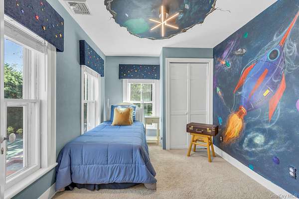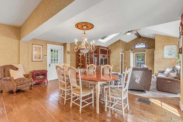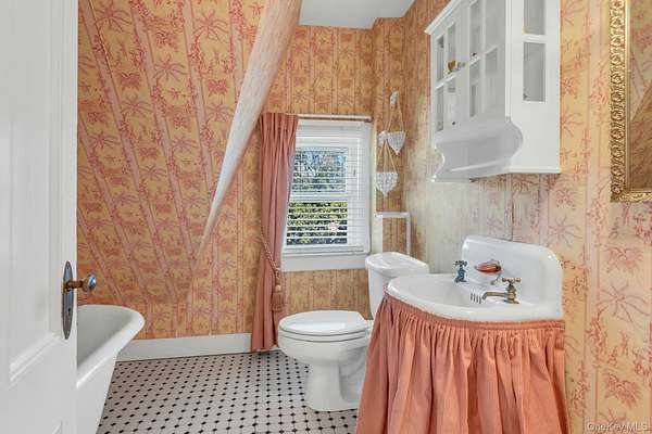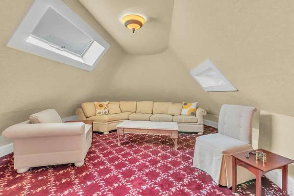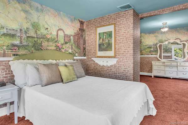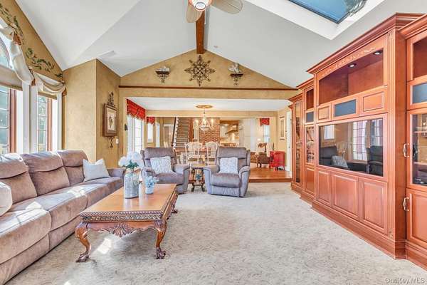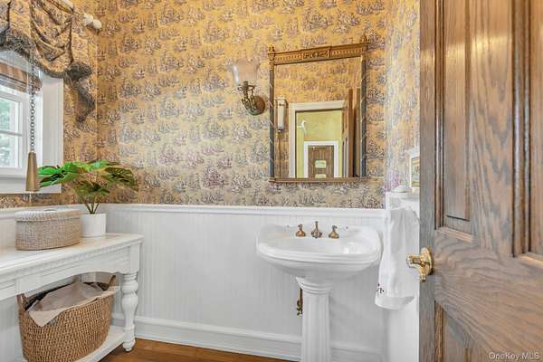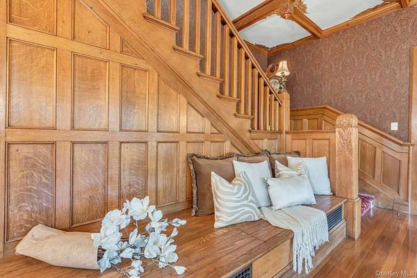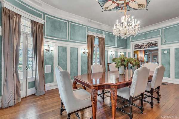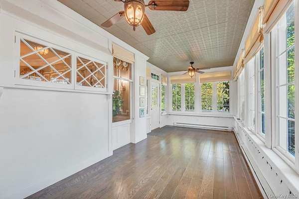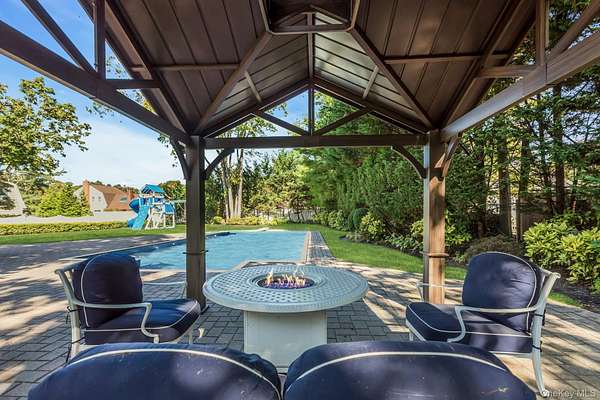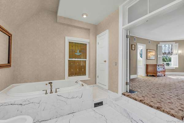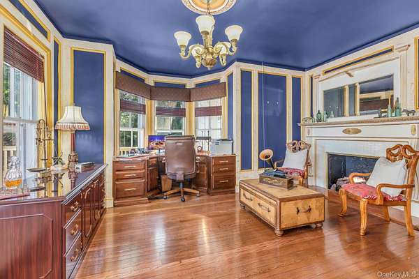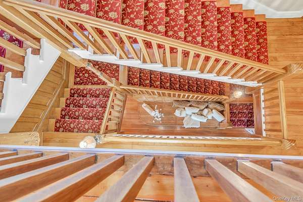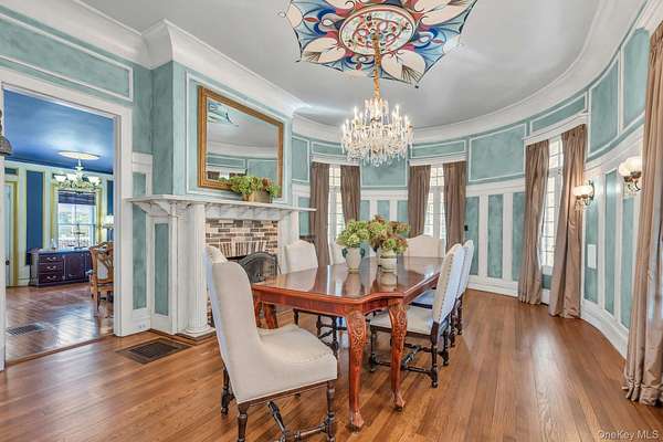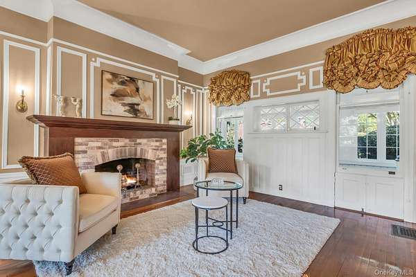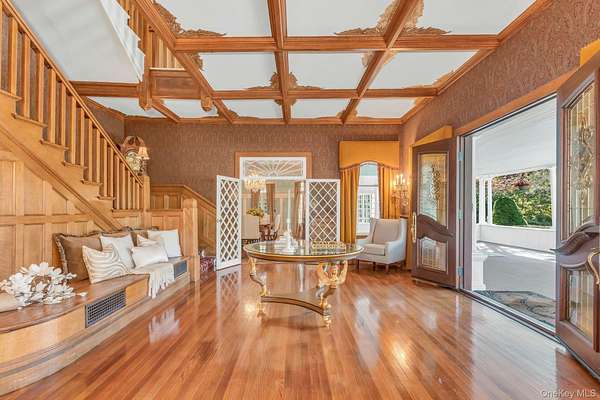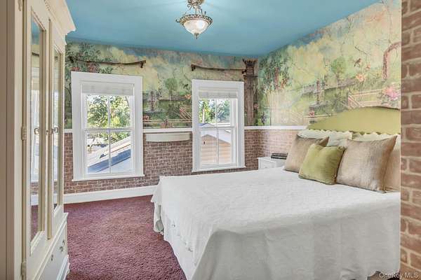 Step beyond the wrought-iron gates and into Towering Pines, a remarkable 1860 Queen Anne Victorian where timeless architecture meets a storybook setting. Perfectly situated in South Bayport, this distinguished residence unfolds across lush, professionally landscaped grounds reminiscent of a private arboretum, where mature specimen trees, vibrant gardens, and curated pathways create an atmosphere of serenity and grace.The property's exterior is a sanctuary of outdoor living--featuring a tranquil koi pond with waterfall, an in ground pool surrounded by flowering gardens, a pergola-covered fire pit area, a child's play space, a covered hot tub, and a dedicated dog run. A circular driveway with a central fountain, porte-cochere, and motor court lead to a detached three-car garage crowned by an inviting bonus loft, ideal for studio use, or private retreat. The home's wraparound porch--one of its most defining features--welcomes you to a residence where craftsmanship and character reign supreme. Through double doors, the grand oak-paneled foyer sets the tone for what's within: hand-carved woodwork, coffered ceilings, crystal sconces, and built-in seating that speaks to the home's heritage and grace. Flanked by a formal living room and dining room, each with its own fireplace, this level showcases extraordinary architectural detail. The living room's curved windows open fully to the porch, while the dining room's raised panel walls and French doors connect seamlessly to the solarium and garden beyond. The handsome study, with its built-in granite-topped desk and intricate millwork, offers the perfect space for working from home in style. The kitchen is a blend of form and function, offering custom cabinetry, granite surfaces, and chef-caliber appliances, flowing effortlessly into an impressive lounge with wine bar and window seating, plus dining area, creating a seamless space for entertaining and everyday living. A cathedral-ceilinged great room with skylights invites gatherings both grand and intimate. Two powder rooms, a laundry room, and a heated enclosed porch complete the first level. Ascend the grand staircase--or the charming butler's stairs--to discover the second floor, where framed original blueprints line the walls beneath stained glass windows said to be authentic Tiffany. The primary suite features a marble-clad bathroom with soaking tub and walk-in shower, as well as a bespoke dressing room with custom closets. A junior suite, currently enjoyed as a library, includes built-in shelving, a fireplace, and access to a private balcony and full bath with original soaking tub. Two additional bedrooms each offer their own distinctive whimsical personality and comfort. The third level continues the home's story with three additional bedrooms--one presently used as a sitting room, another as an office--and a full bath with charming tub. Every inch of Whispering Pines reflects enduring craftsmanship: curved glass windows, custom millwork, porches and balconies that invite quiet moments, and modern amenities including central air, gas heat, and an interior/exterior sound system.