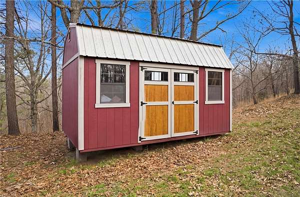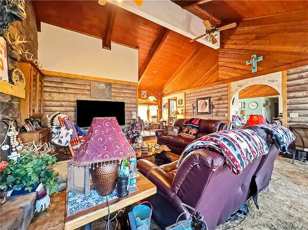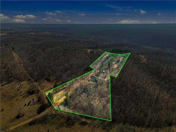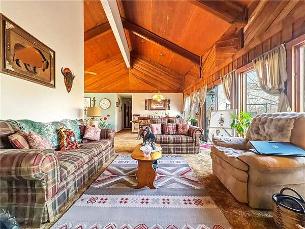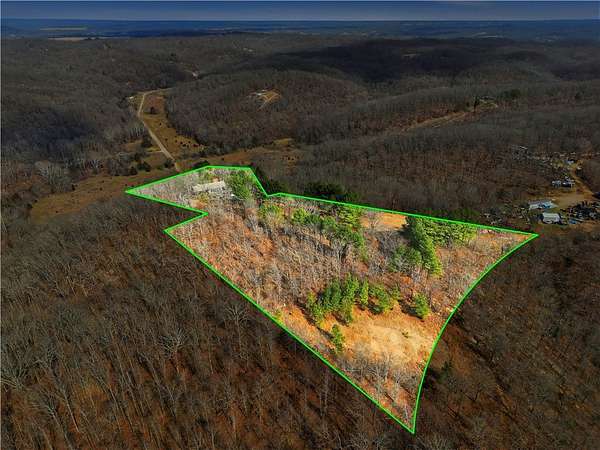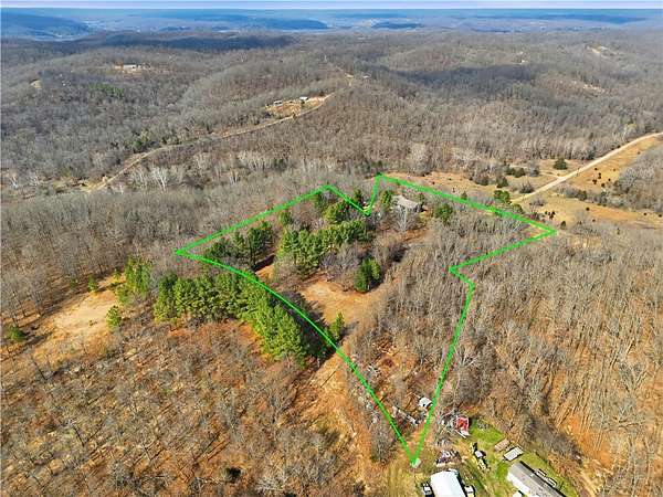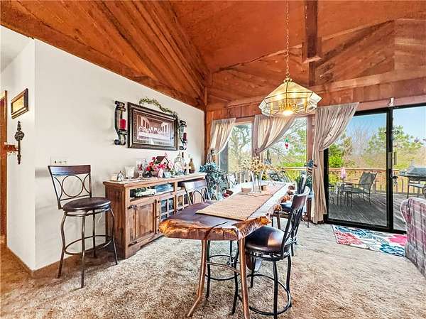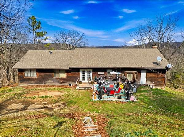 Escape to your own private Ozark retreat with this spacious 2,072 SF (per CH) cabin-style home perfectly positioned on 5.02 beautiful acres offering a tremendous winter mountain view right from your oversized deck. This well-maintained 3-bedroom, 2-bath home features vaulted ceilings, large windows throughout, and a stunning rustic interior finish that creates warmth and character in every room. The open floor plan showcases gorgeous white cabinetry, custom rock and stone tile flooring, a large formal dining room perfect for hosting holiday gatherings, and an oversized formal living room centered around a cozy wood-burning fireplace. Outside, you'll find an asphalt driveway, mature pine trees, gutters, well water, septic system, and OzarksGo fiber internet availability. The oversized deck captures the scenic views, and the acreage provides abundant wildlife along with an excellent additional building site for another home if desired. Need pre approval letter to show. Additional 2.5 acres available.