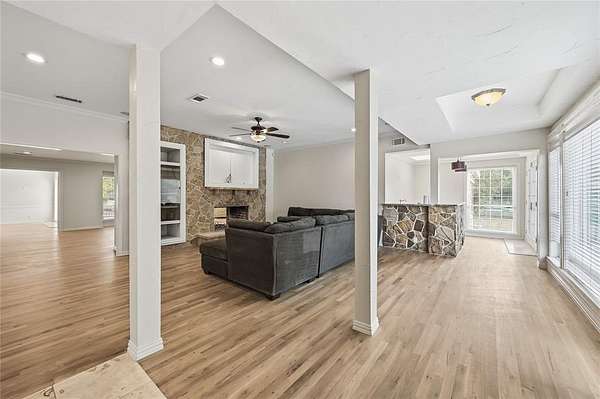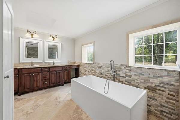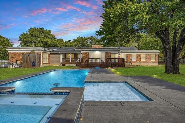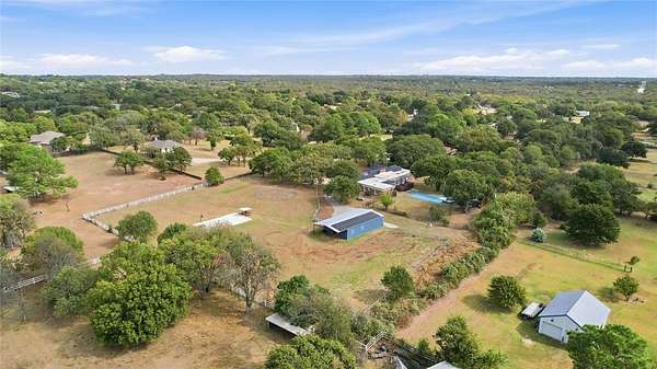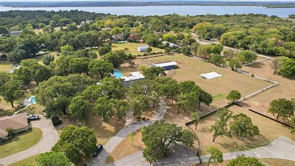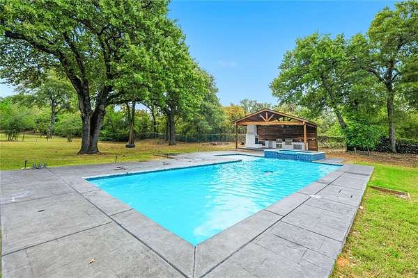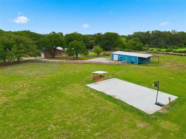 Discover this rare single level ranch retreat tucked away on a serene 2.73 acre lot in top rated Flower Mound, outside city limits and not subject to city taxes with an immense amount of recent improvements, including Solar Panels over barn, which convey to buyer. Boasting approximately 5,085 sq ft of living space, this home offers 4 spacious bedrooms and 5 full baths, each bedroom enjoys its own ensuite for comfort and privacy. Step inside to a gourmet kitchen bathed in natural light from skylights, a chef's dream with commercial grade appliances, generous walk in pantry, granite countertops and a large island central to entertaining. The master suite is a true retreat: frameless shower with body sprayers, new free standing tub, double vanities and expansive walk in closets. A dedicated home office adds flexibility for work or study. The grounds are equally impressive: fenced and ideal for equestrian living, the property features a 50x30 three-stall horse barn with tack room and attached garage or shop to support both hobby and hobbyist. New pool, spa and pavilion offer incredible entertaining options. Pool offers sun deck, 5' depth at middle, and 4' at each end for sport games.