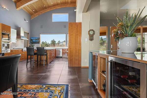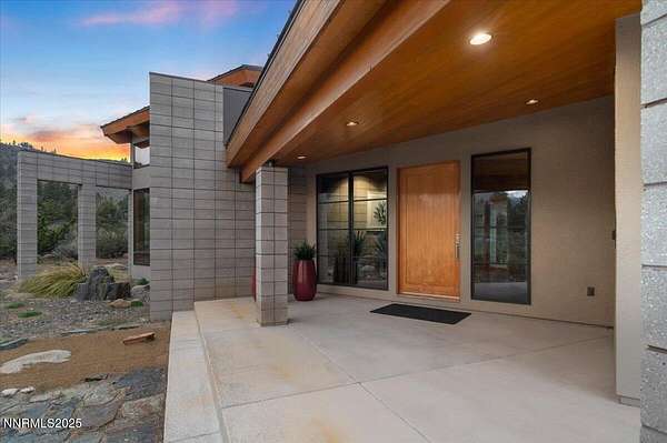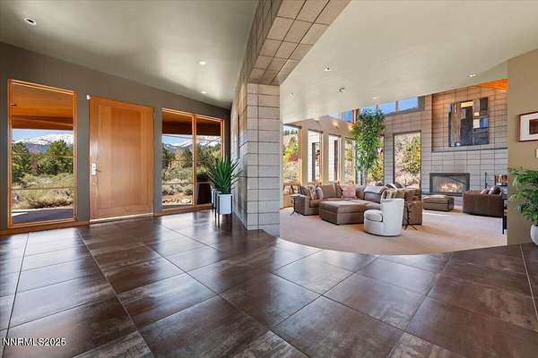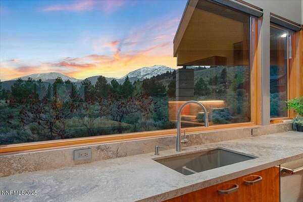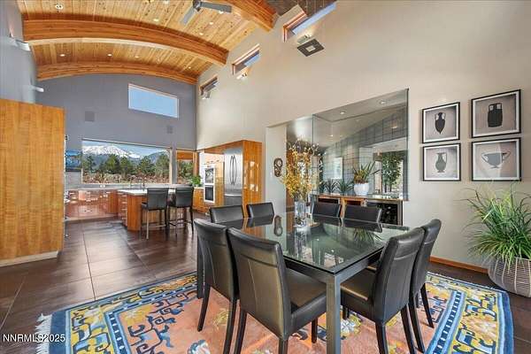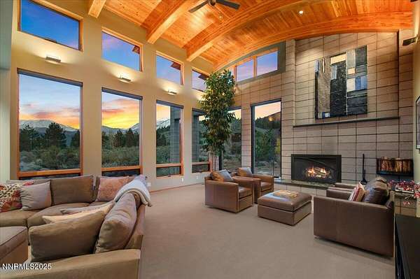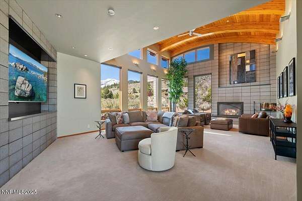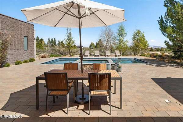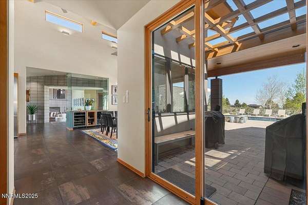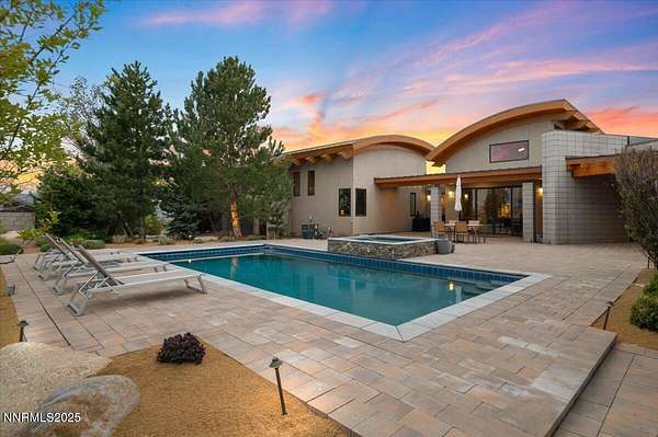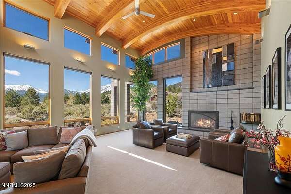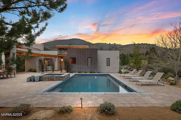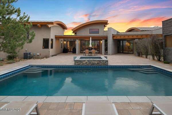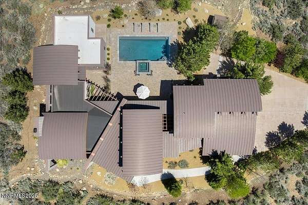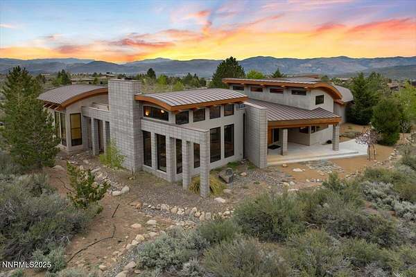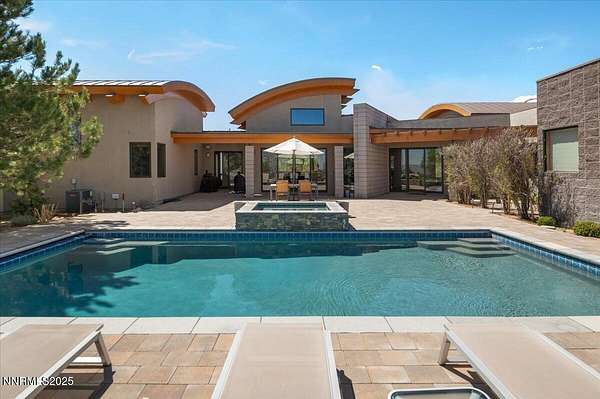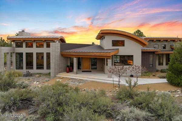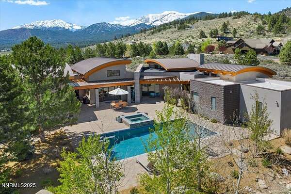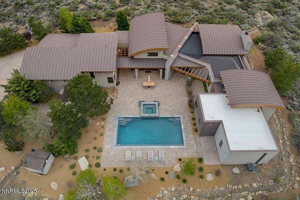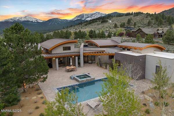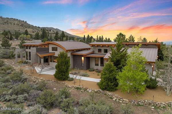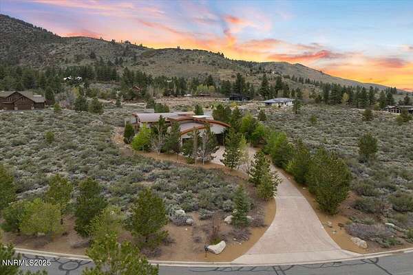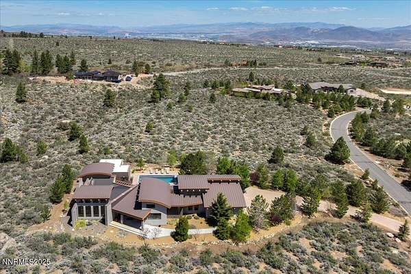 An Architectural Masterpiece in Legend Trails. An architectural phenomenon in design and craftsmanship, this stunning residence is unlike anything else in the area. Thoughtfully sited on over two acres within the gated Legend Trails community, the home offers serenity, privacy, and awe-inspiring mountain views from every room-all just minutes from Mt. Rose Ski Area, Lake Tahoe, and Reno-Tahoe International Airport. Designed to harmonize with the land, the residence blends modern clean lines with natural elements of wood and stone. Inside, radius-curved Douglas Fir ceilings with exposed beams and tongue-and-groove planks soar above expansive living spaces, framed by large rectangular windows that capture panoramic vistas of the Sierras and Virginia Range. Quarter-sawn cherry Heritage cabinetry, and a suite of Miele, Wolf, & Thermador appliances-including a built-in Thermador coffee system and warming drawer-make the kitchen a chef's dream. Recent upgrades include new counters and plumbing fixtures (in the Kitchen and Primary), automatic blinds, customized lighting, and refreshed finishes throughout. The home features two luxurious bedroom suites-a serene primary suite with fireplace, oversized walk-in closet, curved ceiling, and spa-inspired bath with steam shower and jetted tub, along with a spacious secondary suite perfect for family or guests. There is also a flex space loft, with access via a spiral staircase in the secondary Bedroom. A large bonus room offers flexibility as an office, gym, or media space. Outdoors, the property is equally remarkable. The backyard is a private retreat designed for relaxation and entertaining, featuring a sparkling pool, soothing spa, expansive patios, and unobstructed views. Backing to open space, the home enjoys unmatched privacy and a seamless connection to the natural landscape. With nearly two acres of sunny outdoor living and inspired design throughout, 6615 Legend Vista delivers an extraordinary lifestyle in one of Reno's most coveted locations.