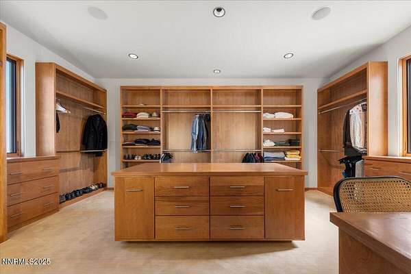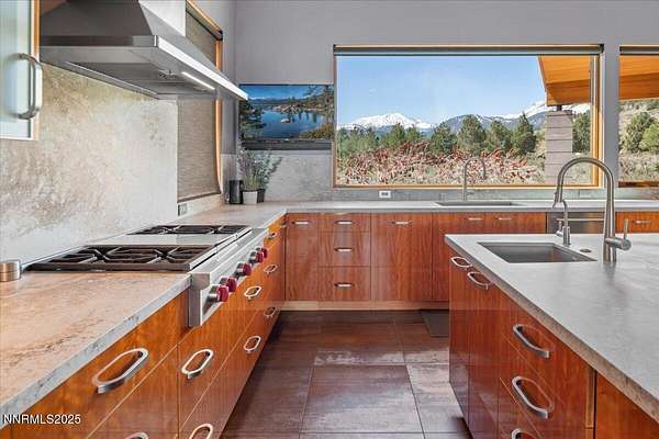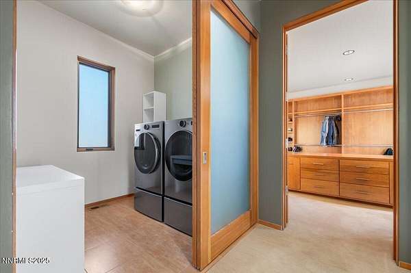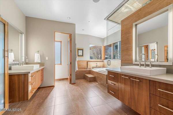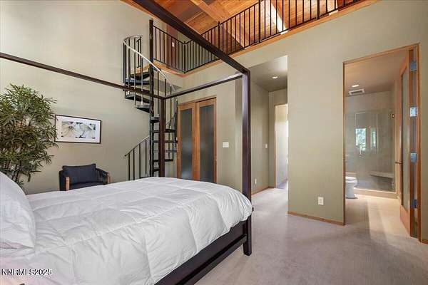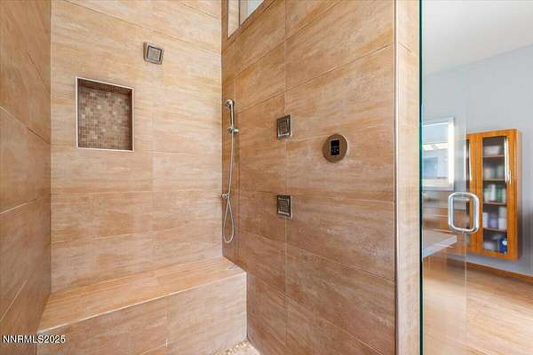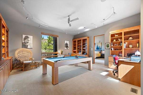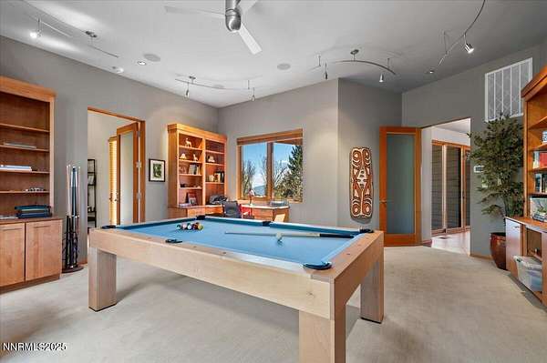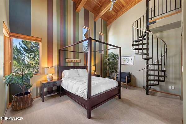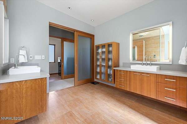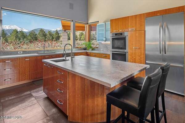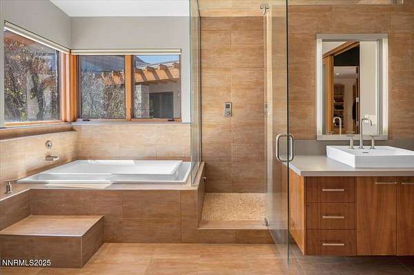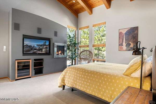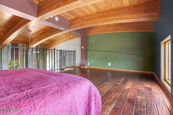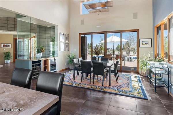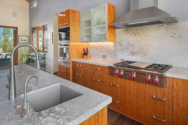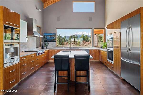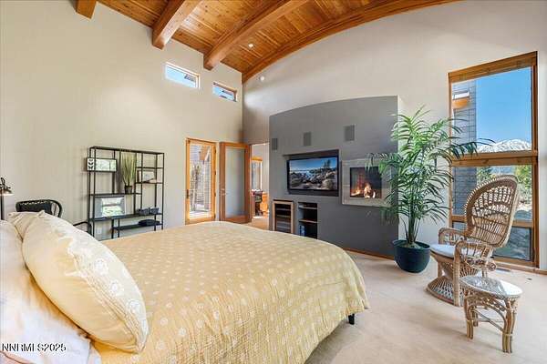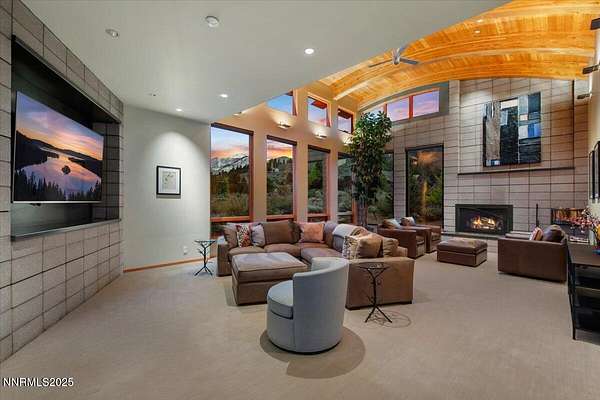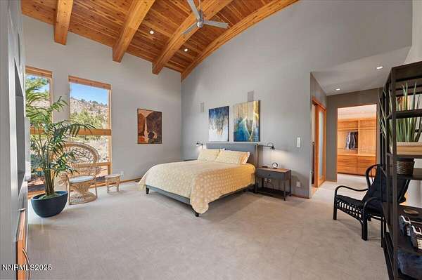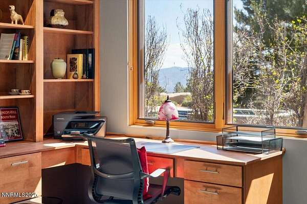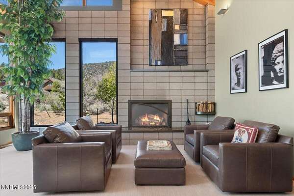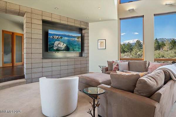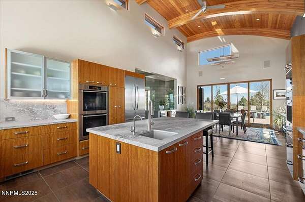 An Architectural Masterpiece in Legend Trails. An architectural phenomenon in design and craftsmanship, this stunning residence is unlike anything else in the area. Thoughtfully sited on over two acres within the gated Legend Trails community, the home offers serenity, privacy, and awe-inspiring mountain views from every room-all just minutes from Mt. Rose Ski Area, Lake Tahoe, and Reno-Tahoe International Airport. Designed to harmonize with the land, the residence blends modern clean lines with natural elements of wood and stone. Inside, radius-curved Douglas Fir ceilings with exposed beams and tongue-and-groove planks soar above expansive living spaces, framed by large rectangular windows that capture panoramic vistas of the Sierras and Virginia Range. Quarter-sawn cherry Heritage cabinetry, and a suite of Miele, Wolf, & Thermador appliances-including a built-in Thermador coffee system and warming drawer-make the kitchen a chef's dream. Recent upgrades include new counters and plumbing fixtures (in the Kitchen and Primary), automatic blinds, customized lighting, and refreshed finishes throughout. The home features two luxurious bedroom suites-a serene primary suite with fireplace, oversized walk-in closet, curved ceiling, and spa-inspired bath with steam shower and jetted tub, along with a spacious secondary suite perfect for family or guests. There is also a flex space loft, with access via a spiral staircase in the secondary Bedroom. A large bonus room offers flexibility as an office, gym, or media space. Outdoors, the property is equally remarkable. The backyard is a private retreat designed for relaxation and entertaining, featuring a sparkling pool, soothing spa, expansive patios, and unobstructed views. Backing to open space, the home enjoys unmatched privacy and a seamless connection to the natural landscape. With nearly two acres of sunny outdoor living and inspired design throughout, 6615 Legend Vista delivers an extraordinary lifestyle in one of Reno's most coveted locations.