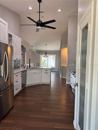 - Ceiling Fans(s), Eat-In Kitchen, High Ceilings, Open Floorplan, Primary Bedroom Main Floor, Solid Surface Counters, Solid Wood Cabinets, Split Bedroom, Walk-In Closet(s)
