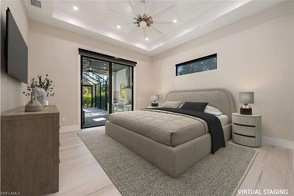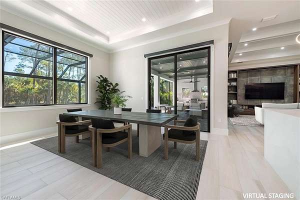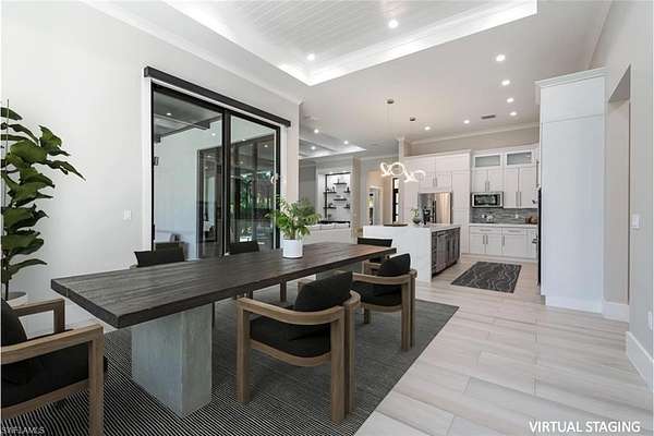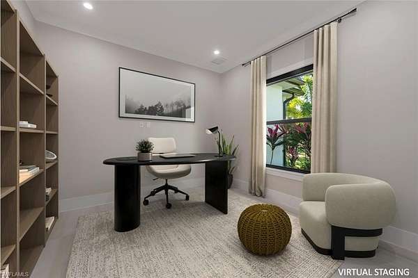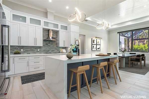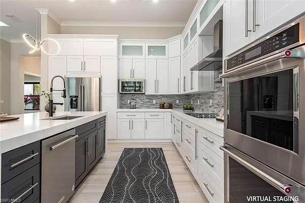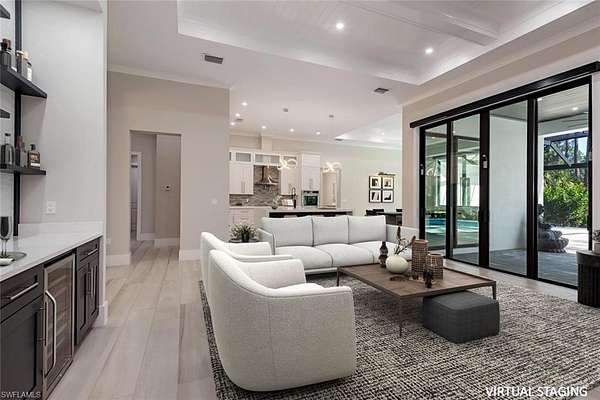 Welcome to 662 9th Street SW, a newly built 2024 residence offering refined design, modern comfort, and exceptional privacy on 2.5 acres in Golden Gate Estates. The home offers 3,207 square feet of living space, including 4 bedrooms, a den, 4 full bathrooms, an expansive lanai, a custom pool/spa and a 3-car garage. Set behind a motorized gated entrance and framed by a lush Clusia hedge, this property delivers a rare combination of space, craftsmanship, and functionality. A paver driveway leads to a thoughtfully designed home featuring soaring 13-foot ceilings in the main living areas and primary suite, wide-plank wood-look tile flooring, and custom architectural ceiling details throughout. The kitchen is both elegant and functional, highlighted by white cabinetry, a large center island with waterfall quartz countertops, KitchenAid appliances with dual ovens, pot filler, and glass tile backsplash. The living area includes a custom built-in media wall and a stylish bar with wine cooler, quartz counters, and open shelving-ideal for entertaining. Natural light fills the formal dining room and living spaces through expansive sliders and custom window treatments, including motorized shades. The primary suite offers a true retreat with dual custom walk-in closets and a spa-inspired bathroom featuring dual vanities, an oversized walk-in shower with dual showerheads, and a freestanding soaking tub. All bedrooms include custom closet systems designed for organization and ease. Outdoor living is a standout feature, with a 590-square-foot covered lanai boasting 12-foot beamed wood ceilings, recessed lighting, and a full outdoor kitchen with grill, side burner, sink, and refrigerator. The saltwater pool and integrated spa are enclosed by a panoramic screen cage, creating a private setting to enjoy Southwest Florida living year-round. Additional highlights include an air-conditioned three-car garage with epoxy floors and glass panels in the doors. Other features include a whole-house reverse osmosis water system, 26kW whole-house generator with underground propane tank, LED lighting throughout, and room on the rear of the property to add a secondary structure. This home offers privacy, quality construction, and modern luxury-perfectly suited for those seeking space and comfort in Naples. Ideally located in Golden Gate Estates, residents enjoy the tranquility of acreage living while remaining within easy reach of Naples' renowned white-sand beaches, boating, golf courses, and an exceptional dining scene. Downtown Naples, Fifth Avenue South, Mercato, and world-class shopping, restaurants, and cultural attractions are all just a short drive away, offering the best of both privacy and accessibility.