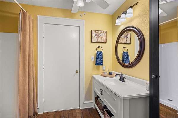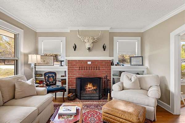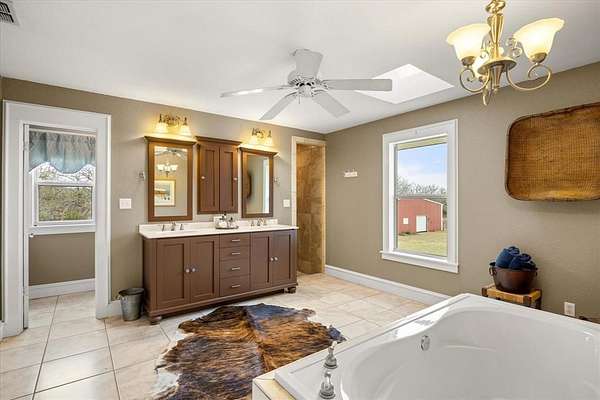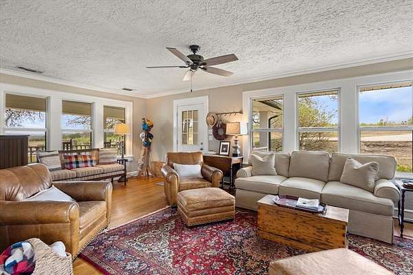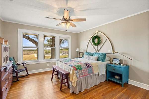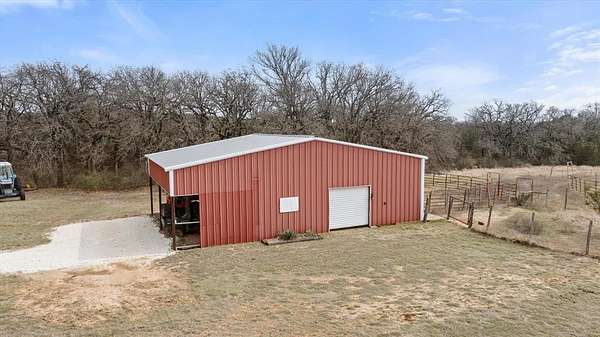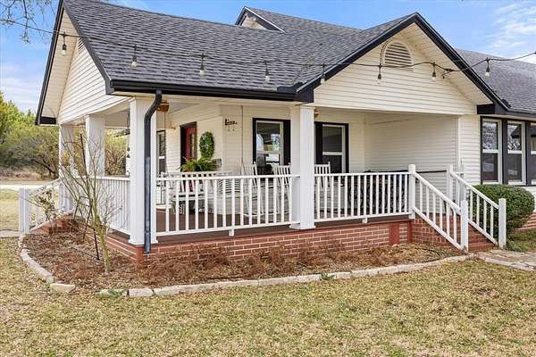 Nestled among 144 acres of stunning Texas land you’ll find a charming craftsman style home. This home was relocated to this land from its original location in downtown Ft. Worth. The traditional wrap around porch welcomes you into this 1920’s home. Inside you’ll find a living space with a fireplace and built-in shelving, an arched doorway leads into the dining room. The kitchen has been updated with granite, crisp white cabinetry, stainless steel appliances including a double oven and a breakfast bar. Off the kitchen you’ll find a cozy office space or a reading nook. The primary suite has incredible natural light, soaking tub, separate shower, dual sinks, coat and walk-in closet. Two additional bedrooms both with walk-in closets share a bathroom. The second primary suite with ensuite bathroom is perfect for guests, or as a mother-in-law suite. All rooms including bathrooms have ceiling fans. The laundry room is conveniently located by the back porch entry, with built-in cabinetry and a sink. Next to laundry is another closet that houses the water heater, an extra fridge and more storage. The property boasts a gorgeous pool perfect for Texas summers with plenty of space for lounge and table seating for relaxing and entertaining. This expansive property is covered in trees, has a pond and is perfect for hunting, horseback riding, camping and more. The barn offers 2 stalls, a goat or sheep stall, workshop space, tack room, storage room and more storage on the second floor. The well house has been upgraded with foam insulation and water system.