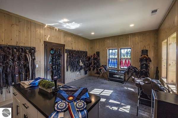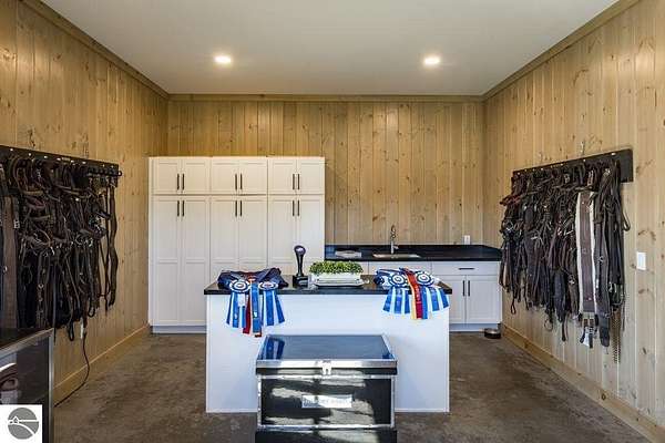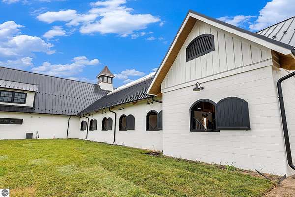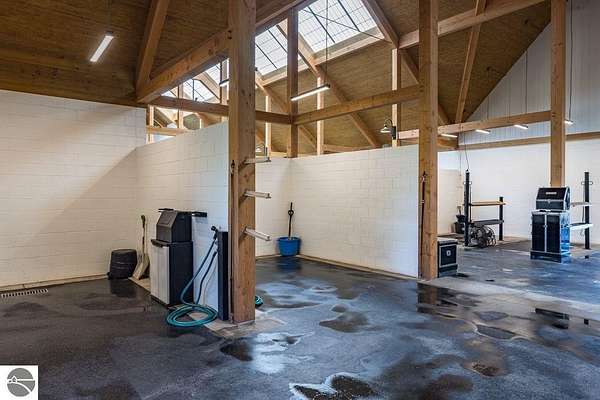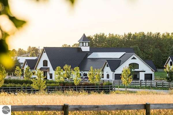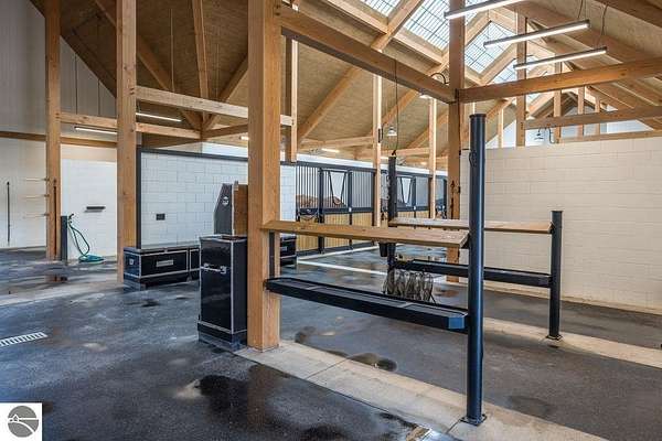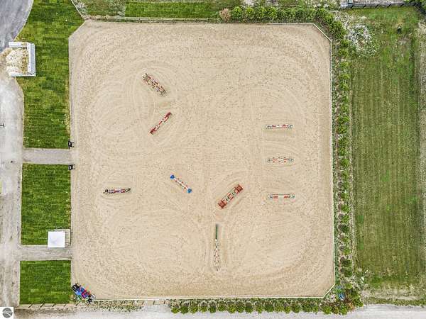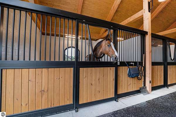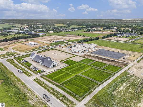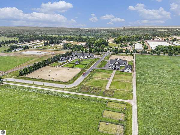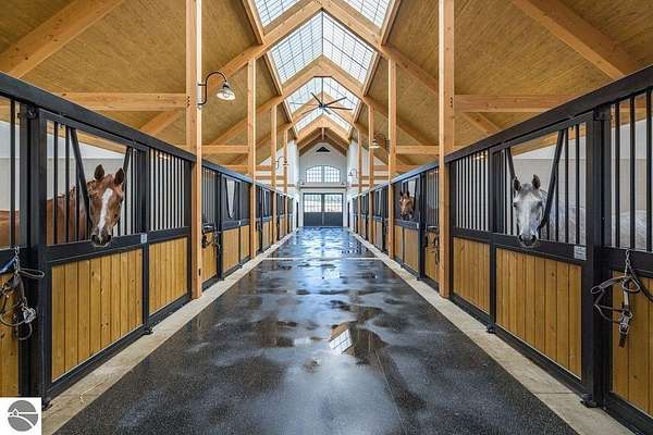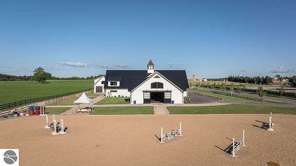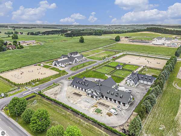 Luxury equestrian facility in Grand Prix Village North, Northern Michigan's premier gated equestrian community. This recently completed 10,858 sq ft custom barn by B&D Builders sits on a high-visibility lot with direct access to Flintfields Horse Park via private bridle paths, while still offering the privacy and security of a gated setting. The barn includes 22 stalls, 4 wash stalls, 4 grooming stalls, feed room, hay storage, laundry room, bathroom, and office. A separate three-car garage includes a well equipped 4-bedroom, 2-bathroom apartment above, perfect for staff or guest accommodations. (Skylights will be installed on the barn in mid-July) The property is fully fenced and professionally landscaped, featuring a 185' x 175' riding arena with an ebb-and-flow watering system and four 60' x 60' fenced paddocks. Grand Prix Village North was designed by equestrians to support a premier equestrian lifestyle, with luxury barns and homes, paved roads, and a private network of bridle paths connecting to the showgrounds. Utilities at the site include electric, natural gas, and high-speed internet. Whether you're a competitor, trainer, or equestrian enthusiast, this is a rare and exceptional opportunity to own a top-tier facility in one of Michigan's most sought-after equestrian communities.