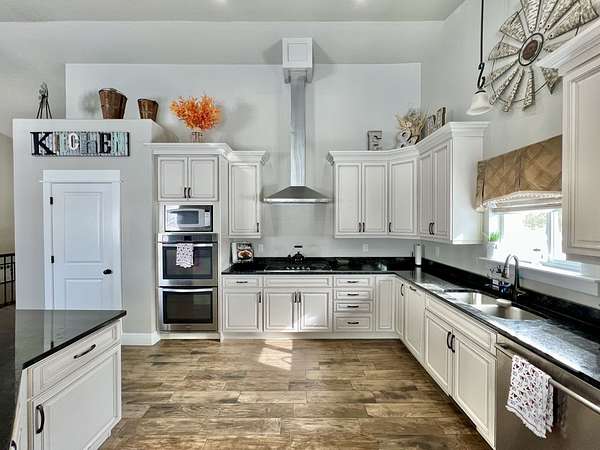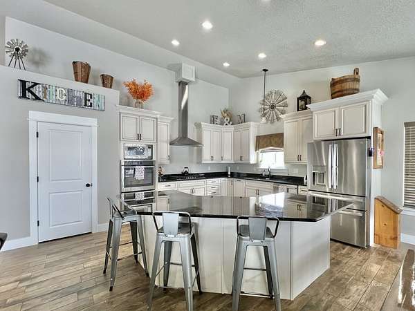Welcome to this spacious and beautifully 5 bedroom, 3.5 bath home offering thoughtful design throughout! Step inside through the impressive 8 foot front door and enjoy the open feel of 9 foot ceilings on the main level. The living room has a large window that fills the space with natural light and a Quadra Fire pellet stove professionally cleaned annually for cozy comfort during cooler months. The gourmet kitchen is truly the heart of the home, featuring a gas cooktop, double ovens, and a Bosch dishwasher. Whether hosting gatherings or preparing everyday meals, this kitchen is built to impress. Downstairs, the fully wired basement offers incredible flexibility, perfect for a living room, home theater, gym or office. Additional highlights include custom blinds throughout. Five raised garden beds ready for your homegrown harvest with a sturdy 6-foot drill steel fence to keep deer away. This home blends functionality and comfort, offering space to relax, entertain, and truly enjoy everyday living.