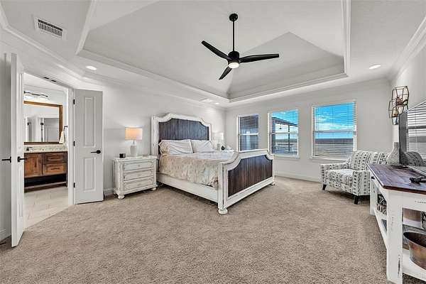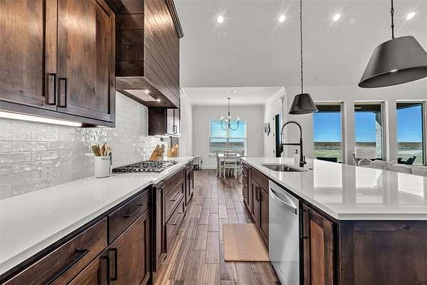Inside, the open-concept layout is designed for real life--whether you're hosting friends or enjoying a quiet night by the gas fireplace. The kitchen is the heart of the home with a large island, gas stovetop, and seamless flow to the living and dining areas. Wood-look tile runs through the main living spaces, while neutral carpeted bedrooms keep things cozy and comfortable. A dedicated home office, 4 spacious bedrooms, and 2.5 bathrooms offer flexibility for work, guests, and everyday living.