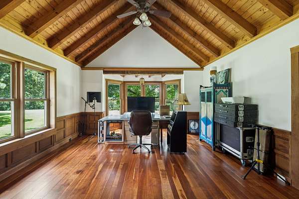 This home has also been a sanctuary for creativity. Its very walls have hummed with the rhythm of music, serving as the backdrop for countless albums and songs written in the home studio. The echoes of legendary artists like Alabama, Bad Company, and Lynyrd Skynyrd, along with the incredible talent of so many more, are forever a part of this home's soul. The cabins on the property, built with over 200-year-old timbers, stand as a testament to the timeless beauty and history that define this land.