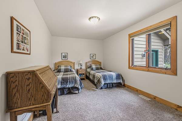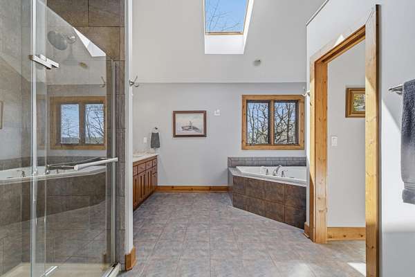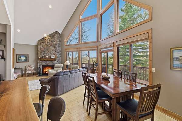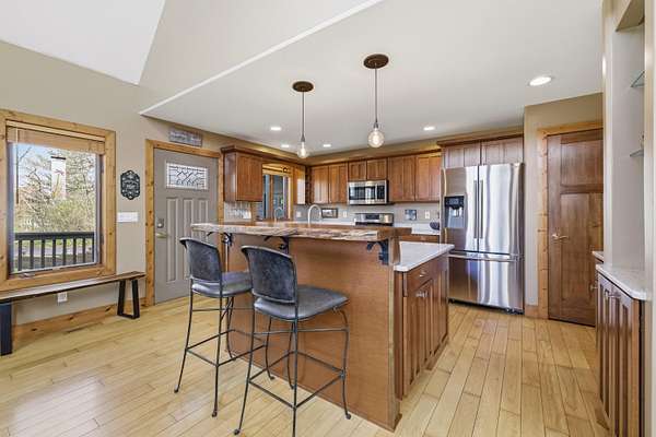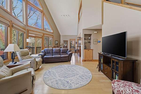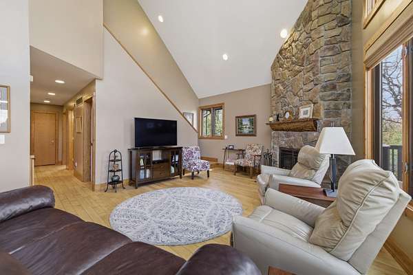 Geneva Territory is home to this Chalet-style retreat with water and nature views. Rich Maple floors and rustic trim add warmth and character to the home. The gourmet kitchen features quartz countertops, dual sinks and custom cabinetry. The dining and living rooms are open with vaulted ceilings and a stone fireplace. The upper deck overlooks the peaceful pond with its picturesque island. Two bedrooms with a full bath are on the main floor. The primary suite is on the second floor with a luxurious en suite bath and spacious closets. The lower level has a fourth bedroom and full bath near the spacious family room. Another deck with a hot tub is on the walk out lower level. Neighbors share the beach and picnic area offering swimming, fishing, paddling, and a shoreline walking trail.