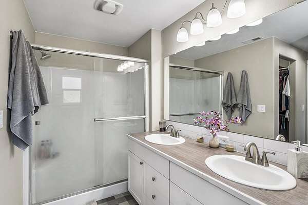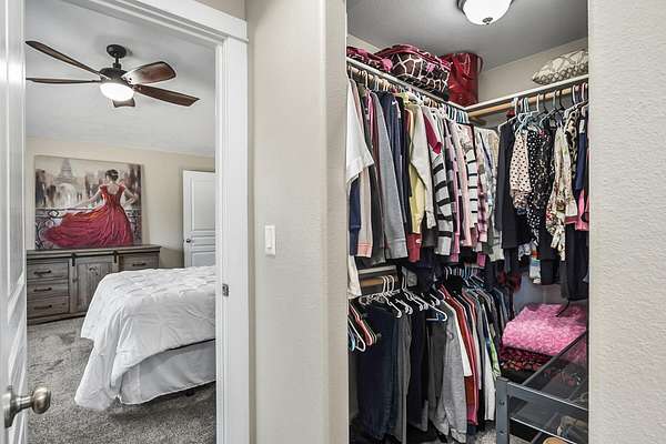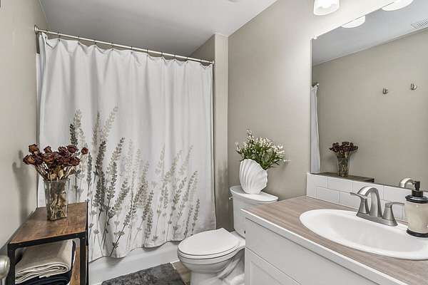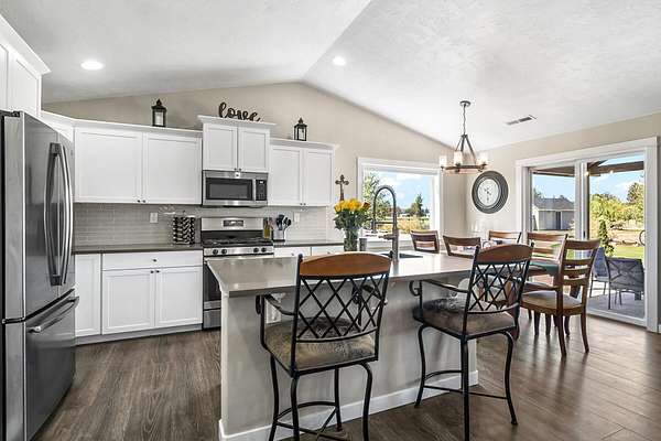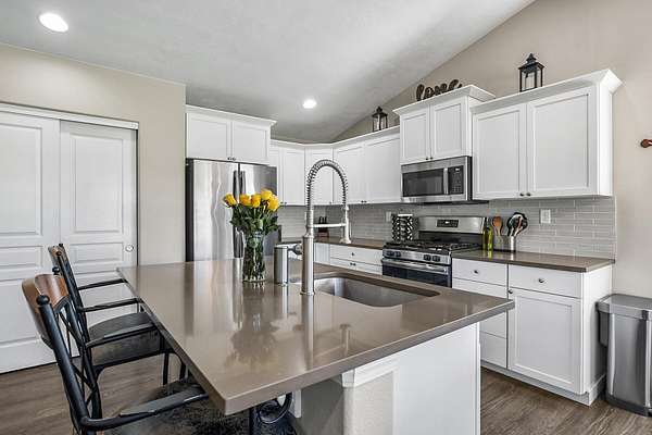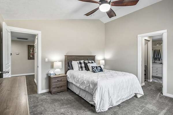 - Breakfast Bar, Ceiling Fan(s), Enclosed Toilet(s), Fiberglass Stall Shower, Kitchen Island, Open Floorplan, Pantry, Primary Downstairs, Shower/Tub Combo, Solid Surface Counters, Vaulted Ceiling(s), Walk-In Closet(s)