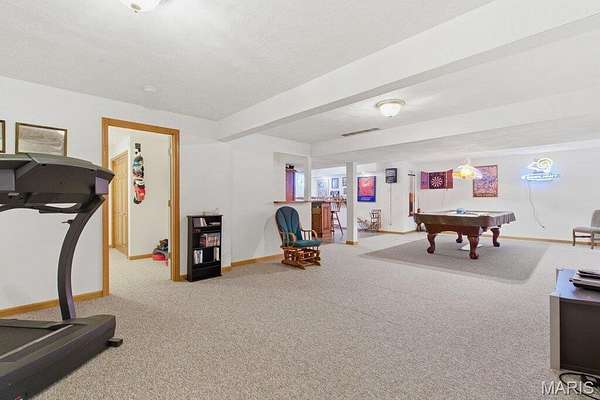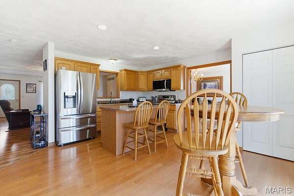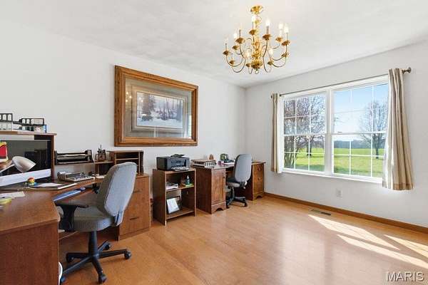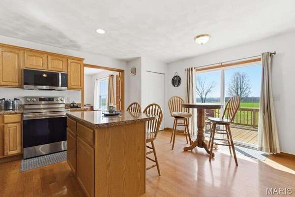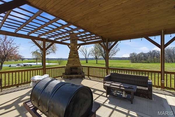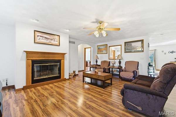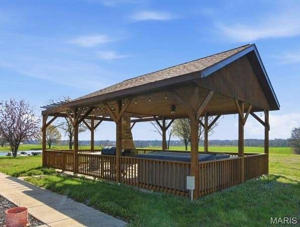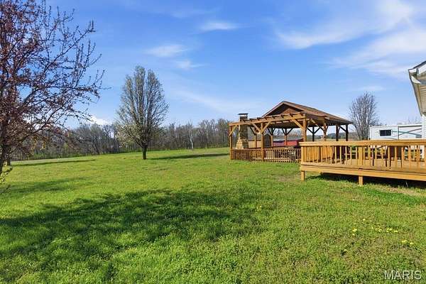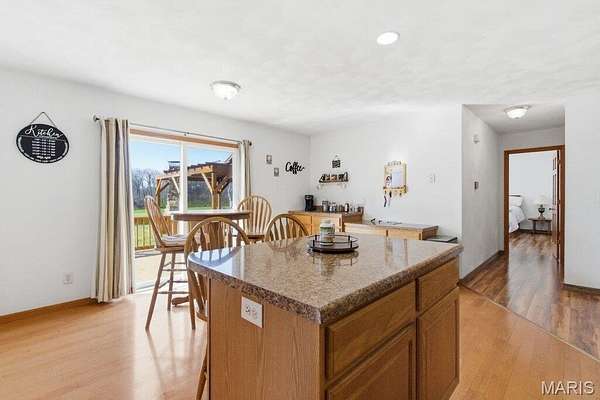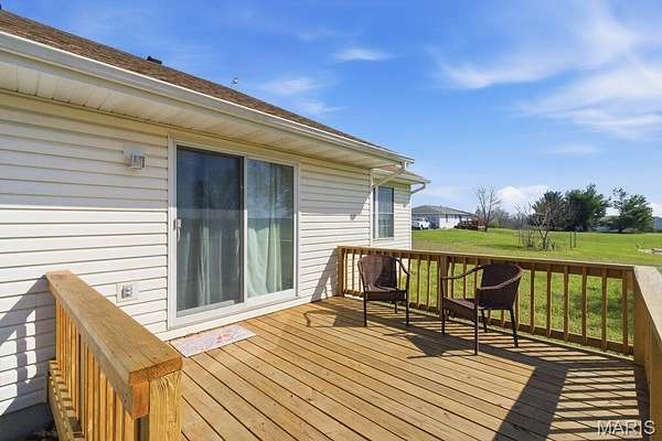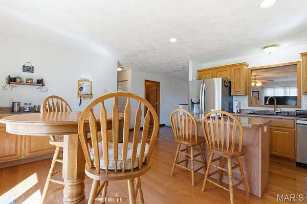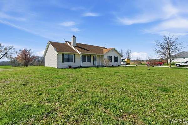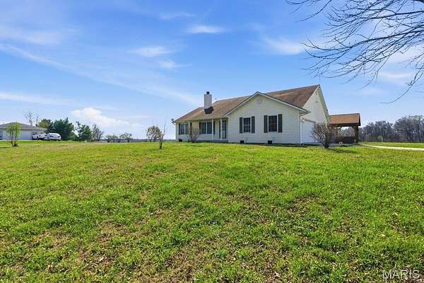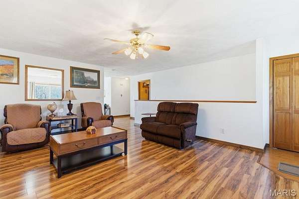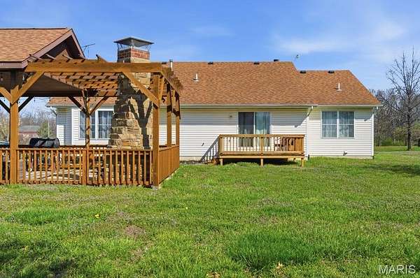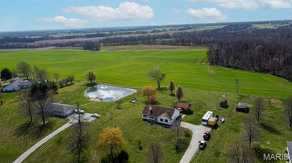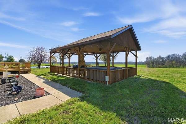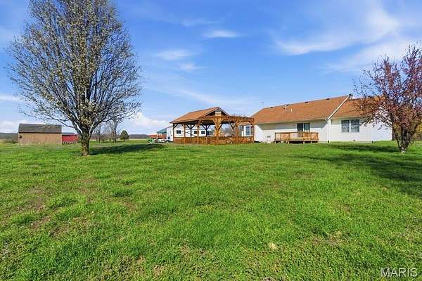 This beautifully maintained home on 2.55 acres is designed for effortless entertaining and everyday comfort. Nestled in the rolling hills just seven miles outside Waterloo, it offers one of the prettiest settings around, with endless picturesque views. The custom pavilion—complete with a stone fireplace and hot tub—overlooks a private field, creating the perfect backdrop for unforgettable evenings. With approximately 2,800 finished square feet and located in Waterloo School District, the home features a main-floor master suite and laundry room for convenient living. Step into a spacious family room with a wood-burning blower fireplace and newer industrial Stage 4 laminate flooring and solid wood doors throughout, framed by a large picture window ideal for seasonal décor. An arched doorway and staircase to lower level add charm and convenience, while the open kitchen boasts stainless appliances, a farm sink, solid wood cabinetry with slide-outs, granite-look counters, and a beverage station with pantry (2025 remodel). Sliding doors from the breakfast area open to the rebuilt 2025 deck overlooking the impressive pavilion with hot tub and stone fireplace. A formal dining room with oak flooring and French doors sits just off the kitchen. The hall bath features new LVT flooring, a Hardy Board vanity, and a tub/shower combo. The main-floor bedrooms include one with a double closet and another—the primary—with laminate flooring, a bay window, and a spacious walk-in closet. The newly remodeled master bath showcases a double vanity, waterproof Hardy Board LVT flooring, and a walk-in shower with dual rain heads for two. A ceramic-tiled laundry room and attached two-car garage with attic storage complete the main level. The lower level is a weekend retreat, featuring oak stairs, ceramic tile, a large family room with a clawfoot pool table, custom bar with dry sink and bottle storage, and a wet sink on the bar back. Two nonconforming bedrooms (no windows) offer flexibility for guests, a gym, office, or craft space, and the lower-level bath includes a ceramic tile shower and pedestal sink. Major updates include a 2024 gas furnace and AC, 183-foot deep well with sand filtration (no water or sewer bill), 2025 water softener, new hot water heater, 2025 kitchen remodel and appliances, 2025 deck, 2025 master bath remodel, and new flooring throughout. For a full list of upgrades, see the MLS listing information sheet.