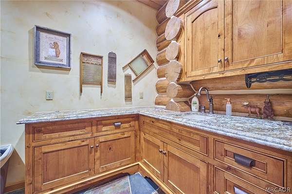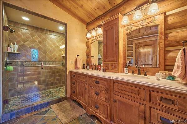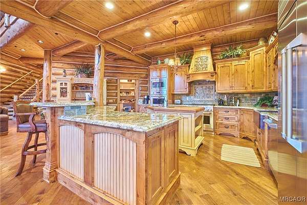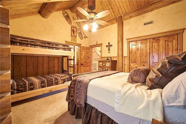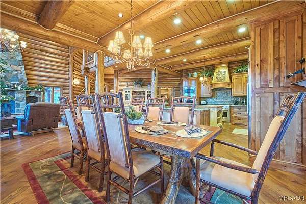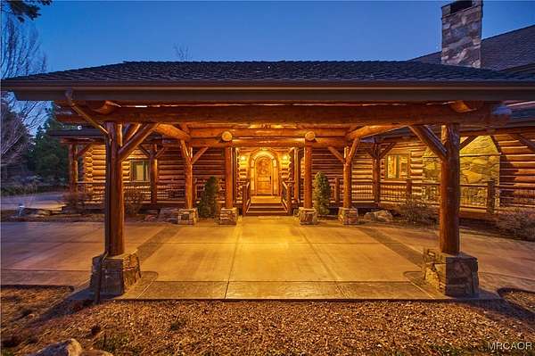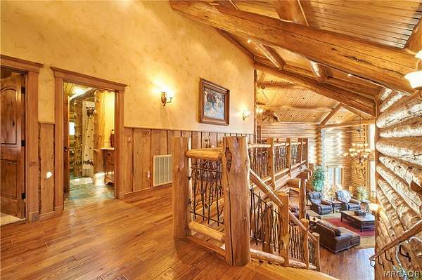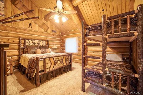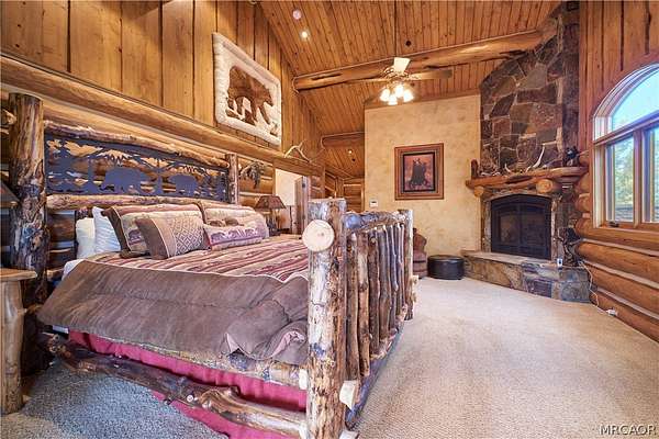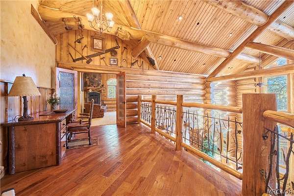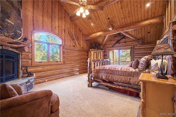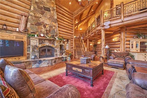 Experience true mountain luxury in this immaculate Lindley full-log home, perfectly situated on over 2.5 acres across two parcels-with a third parcel also available. Surrounded by a blend of professional landscaping and pristine forest, this property offers unmatched curb appeal and complete privacy. A gated entrance, circular stamped-concrete driveway, and porte-cochere create an impressive arrival experience. Enjoy sweeping views of the surrounding mountains and abundant outdoor space to unwind. Over 2,500 sq. ft. of wraparound Brazilian hardwood decking-including a covered outdoor BBQ area-provides year-round enjoyment and seamless indoor/outdoor living. Inside, the craftsmanship is exceptional. The home features 3 en-suite bedrooms, each with vaulted ceilings. A spacious game room adds another layer of comfort and entertainment, complete with its own fireplace, built-in bunks for guests, and a full wet bar. The dramatic great room showcases soaring ceilings, a real rock fireplace with a massive hearth, and floor-to-ceiling windows framing the treetops. The open kitchen is designed for gatherings, offering a breakfast bar, granite countertops, tiled backsplash, GE stainless steel appliances, and a hickory island. The adjoining dining area opens directly to the deck. Premium finishes are found throughout, including distressed hickory flooring, Alderwood cabinetry and doors, and wrought-iron railings. The expansive primary suite is a true retreat, featuring a private covered balcony, a large walk-in closet, and a spa-like bathroom with heated floors, a tiled shower, and a soaking tub. A second suite on the main level offers deck access and a beautifully upgraded bathroom-ideal for guests or multi-generational living. Meticulously cared for and maintained in true turn-key condition, this home is the perfect blend of luxury, comfort, and timeless mountain craftsmanship.