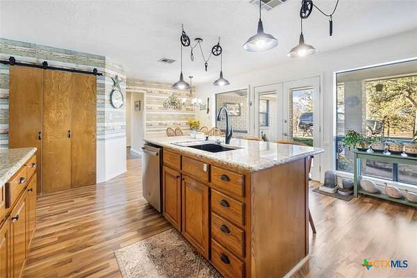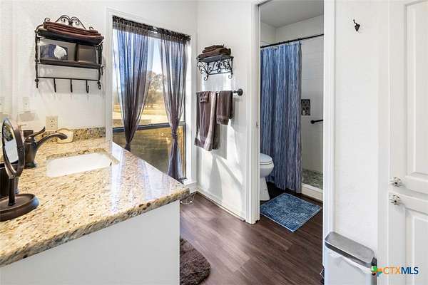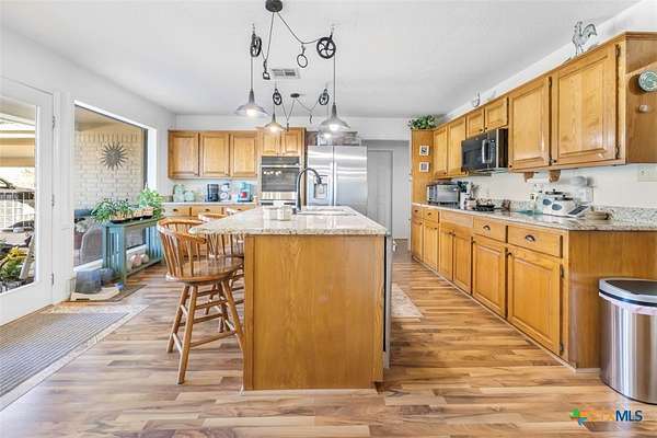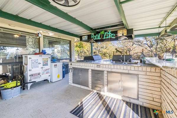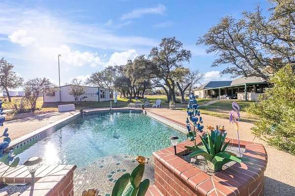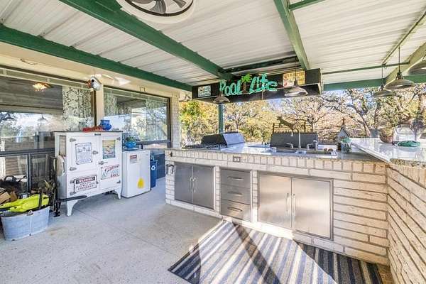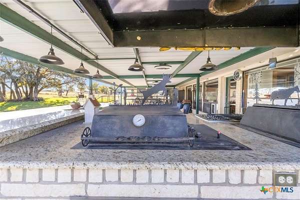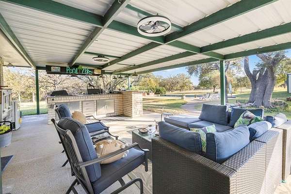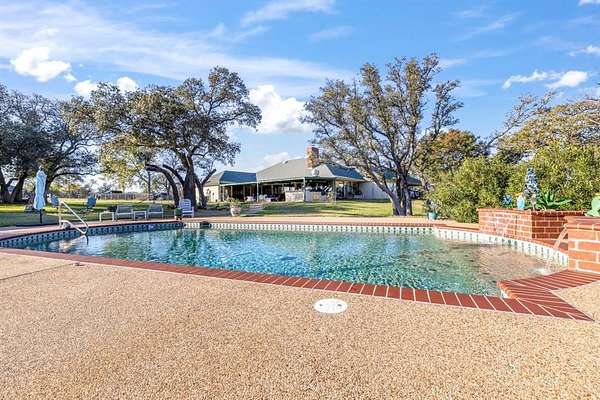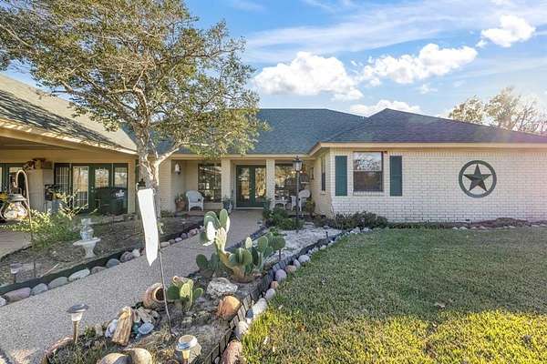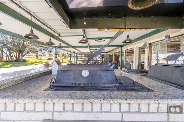 As you drive in, towering Post Oak trees shade the lush St. Augustine grass, creating a welcoming and scenic approach. Inside, the 3,800 sq. ft. home is warm, comfortable, and exceptionally well cared for. It includes 3 bedrooms, 2.5 bathrooms, granite countertops, and beautiful flooring throughout. The kitchen offers excellent storage and a double oven, making it perfect for hosting or cooking for a crowd. The spacious game room provides flexible space for movies, kids, hobbies, or additional living area. Stepping outside, you will find a standout outdoor setup with a full kitchen that includes multiple grills, a range, and a hot-water sink. The fenced backyard is ideal for pets, and the large patio and inground pool with a 6-foot deep end make entertaining easy and enjoyable. A well-fed sprinkler system keeps the grounds low maintenance, and the home's elevated hilltop setting provides a grand view of the surrounding landscape. A private well provides ample water to the property.