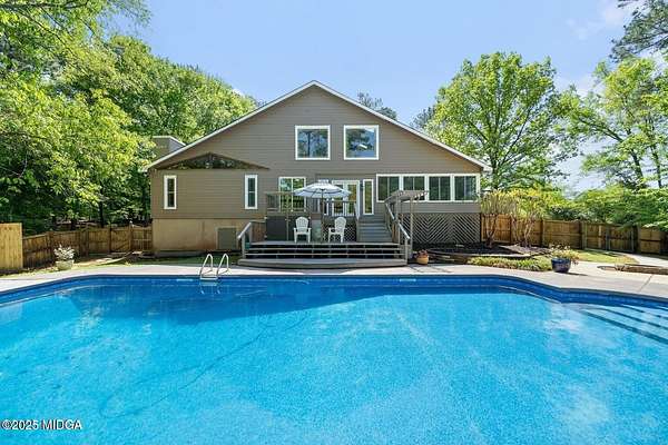 Back on the market at no fault to the seller. Welcome to this stunning 3,000 SQFT home nestled in the gated River North community, just minutes from the front gate. With 3 bedrooms, 2 full baths, and 2 half baths, this home offers the perfect blend of Southern charm and thoughtful design. The split floor plan provides privacy and space, ensuring everyone has their own retreat. Step through the front door into a welcoming foyer that opens into a spacious step-down living room with soaring ceilings and hardwood floors, complete with a stack stone finished fireplace. Just off the living room is a bright sunroom--ideal for enjoying your morning coffee or a peaceful evening unwind. The heart of the home is the kitchen, featuring tiled floors, a built-in stove, island seating, and a cozy eat-in area. Off the kitchen, you'll find both the laundry room and a large flex space previously used as an art room--perfect for creative projects, a home office, or extra living space. This property offers plenty of storage space, and a formal dining room sits just off the kitchen, creating a smooth flow for entertaining. The master suite offers a quiet retreat with bamboo flooring, its own fireplace, a soaking tub, separate shower, double vanities, and a walk-through closet with built-in shelving that leads directly back to the kitchen--for those late-night snacks. Upstairs, the loft features gym flooring, built-ins, large windows overlooking the backyard, and a hidden closet behind a mirrored panel--adding a fun and functional surprise. The grand outdoor oasis is truly one of the standout features of this home, all set on a beautiful 2-acre lot. The fenced-in private backyard is perfect for relaxation and entertainment, with an in-ground saltwater pool, diving board, fire pit, beautiful flower beds ready for the next homeowner to plant their own gorgeous blooms, mature pear trees offering shade and seasonal fruit, and posts for hanging summer sails. A 2-tiered porch with storage leads to a convenient half ''pool'' bath, making it easy to entertain by the water. Additionally, the side yard is fully fenced and features its own deck, ideal for grilling or letting your pets roam. For a more rustic retreat, an additional fire pit on the side of the house creates a cozy, wooded feel. With plenty of parking available, including a 2-car garage, this property offers space, comfort, and charm in every direction. River North is a gated community with an active HOA and the added option of joining the neighborhood country club. Members enjoy access to a community pool, tennis courts, a fitness center, and an 18-hole golf course. The country club also serves food, offering a great place to grab a bite and connect with neighbors. All measurements are approximate. Macon address with Jones County taxes!!!