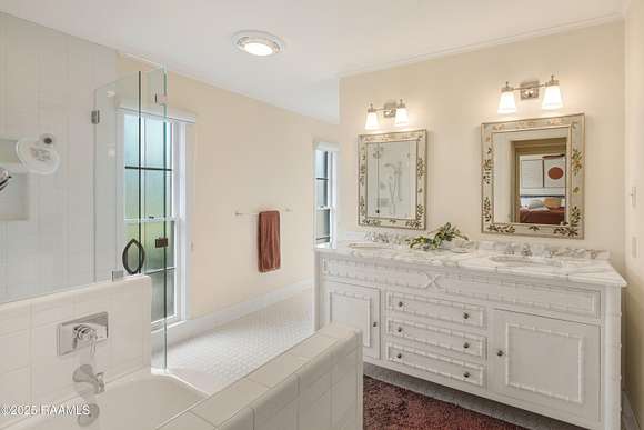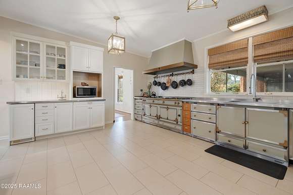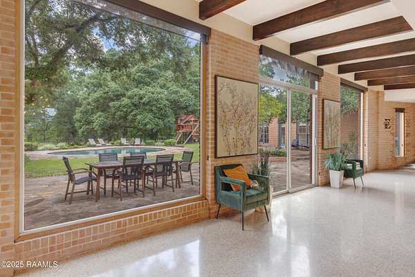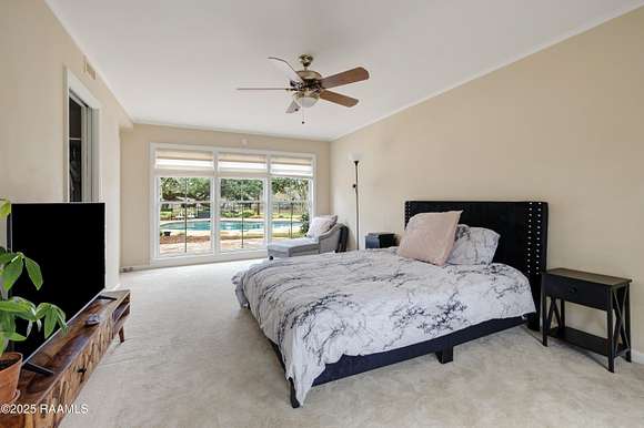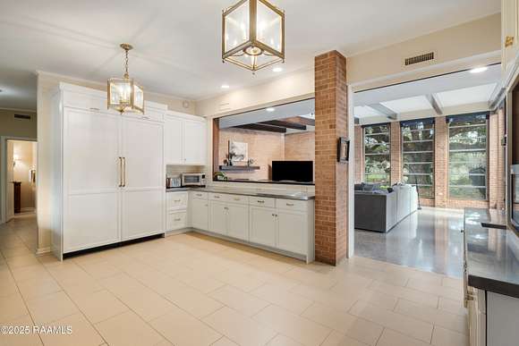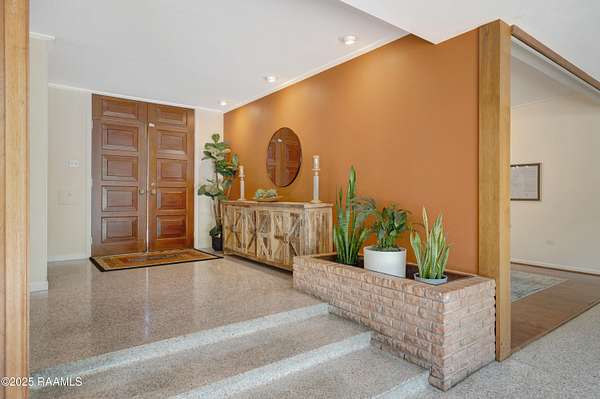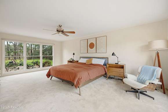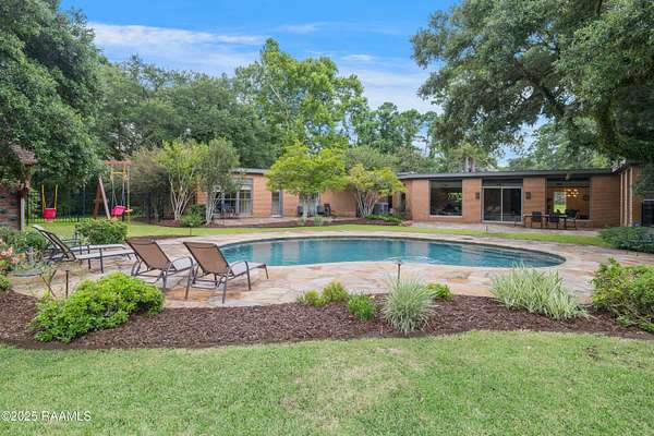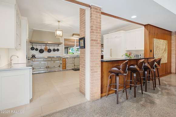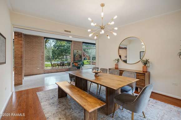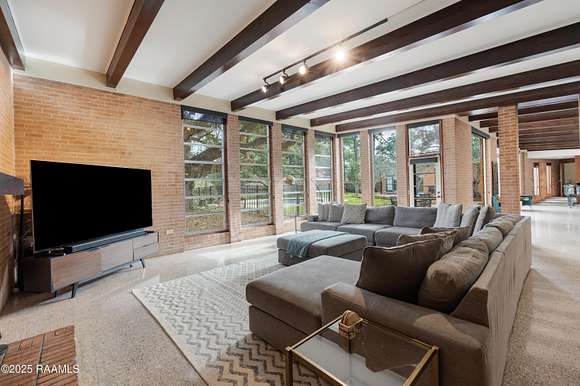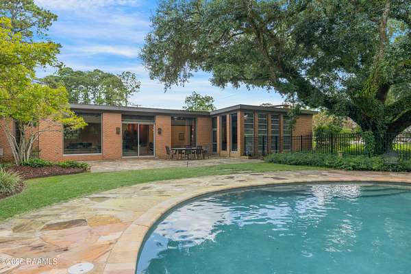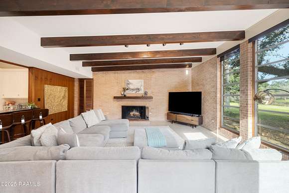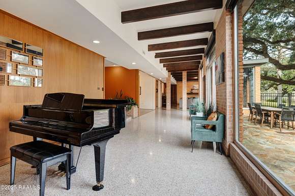 Welcome to 4883 square feet of timeless Mid-Century Modern elegance on historic Main Street in New Iberia. Perfectly located on a picturesque 4-acre bayou-side lot, this architectural gem underwent an over $500,000 renovation in 2012 by the previous owner--painstakingly restoring its original 1957 glamour while incorporating luxurious, modern-day amenities.Inside, terrazzo floors flow seamlessly through expansive, light-filled living spaces framed by floor-to-ceiling windows. The reimagined chef's kitchen is a showstopper, anchored by a custom La Cornue Grand Palais range with matching cabinetry, stainless steel countertops, and top-of-the-line Thermador appliances.The primary suite is a tranquil retreat with a fully renovated bath featuring artisan-crafted J. Tribble cabinetry, Calacatta Vagli marble topped vanity, restored original soaking tub, and a separate walk-in shower.No detail was overlooked--from new electrical, plumbing, lighting, and roofing to custom Hunter Douglas window treatments and solar shades. The home also boasts 2 Rinnai on-demand water heaters and a whole-house generator for comfort and peace of mind.Step outside to your private oasis: the heated pool with Genesis gunite plaster, surrounded by flagstone patios and lush, professionally redesigned landscaping with LED lighting. The updated boxing and facia add a polished finish to the home's striking architecture.This is a rare opportunity to own a statement piece of design history--expertly updated for modern living and nestled in a breathtaking bayou-front setting.