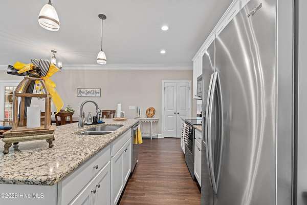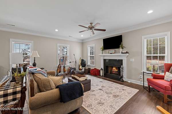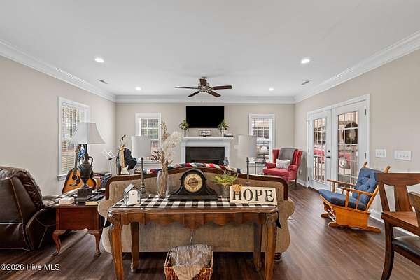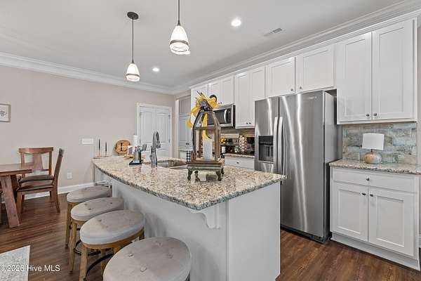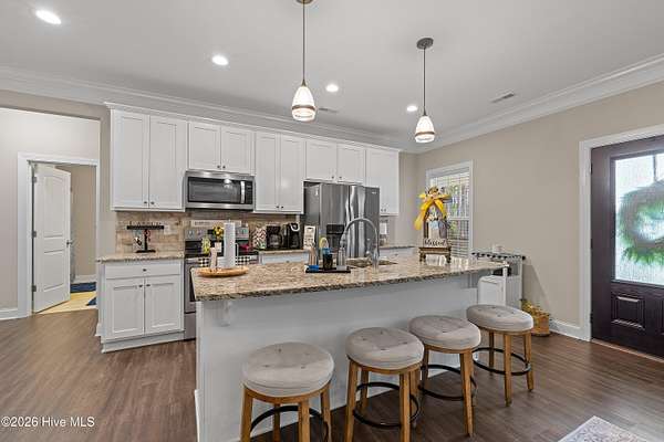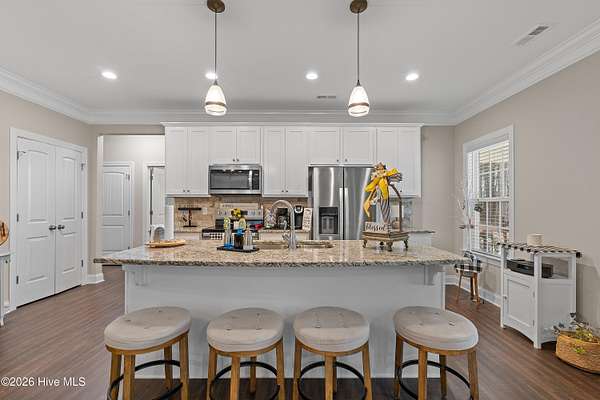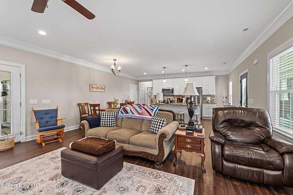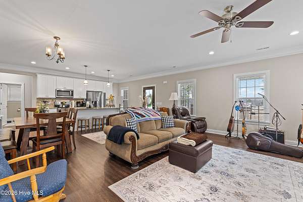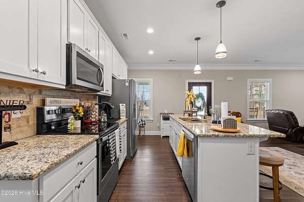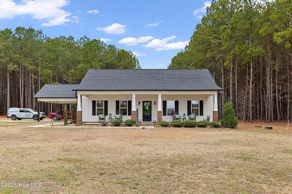 Experience the freedom of country living w/ the comfort of modern design in this beautifully crafted ranch home set on 2.05 privateacres no HOA, no subdivision, just space to breathe & room to roam. Bright open floor plan seamlessly connects the family room, dining area & kitchen.Family room features a cozy gas log FP, while elegant two-piece crown molding adds a touch of charm & craftsmanship throughout the main living areas& primary suite. Heart of the home is the stunning kitchen, complete w/ center island, granite tops, tile backsplash, soft-close doors & SS appliances including the refrigerator. LVP flooring flows through the main living areas & the spacious primary suite, where you'll find dual sinks, WIC & shower w/bench seating. A private door from the primary bedroom leads directly to the oversized screened porch. 2-car carport, tankless water heater, & generator