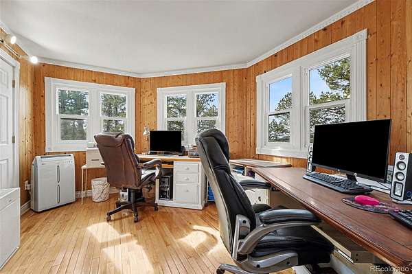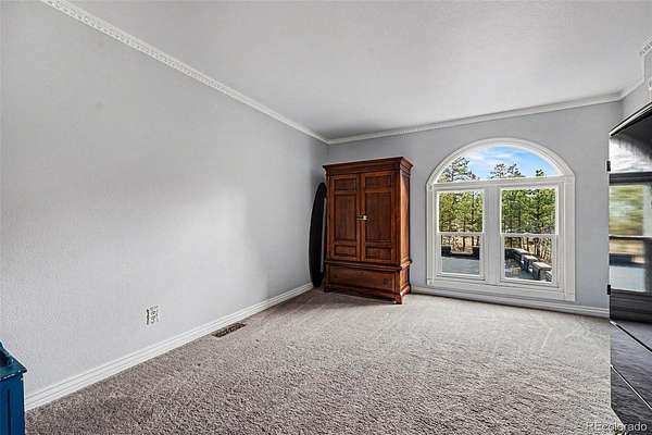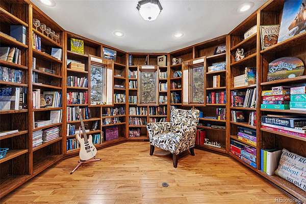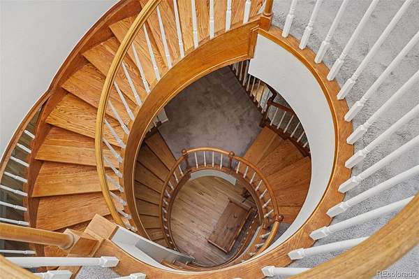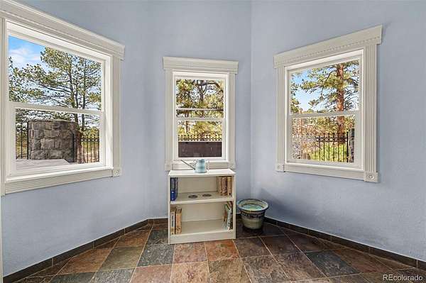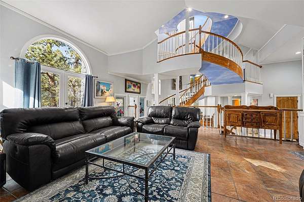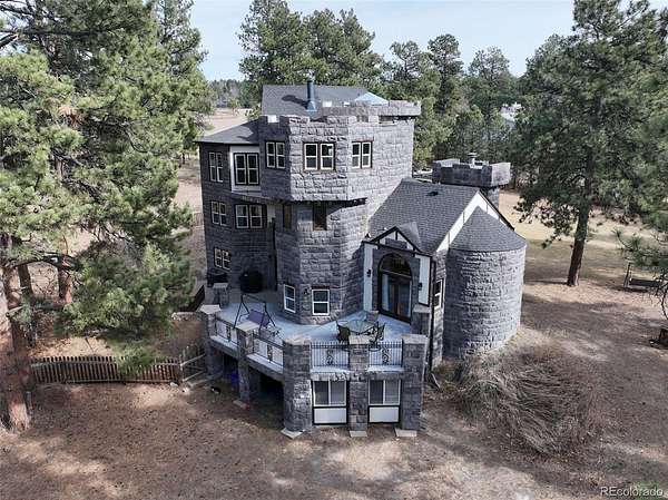 If you’ve ever wanted to live somewhere people call “The Castle,” this is it! Set on 2.8 wooded acres in Hidden Village, this unforgettable home offers privacy, character, and flexibility for entertaining, everyday living, or multigenerational needs. The stone exterior, turrets, and balconies create a true storybook presence, while mountain views and tall pines surround you with Colorado tranquility. Inside, the grand entry opens to soaring ceilings and a dramatic spiral staircase illuminated from the skylight above. The main level lives large and open, with the great room flowing into the dining area, sunroom (with pet access), and spacious kitchen featuring granite counters, stainless appliances, and abundant cabinetry. It’s ideal for hosting holidays or simply enjoying a quiet evening at home. Upstairs you’ll find multiple bedrooms, a loft sitting area, and one of the home’s most memorable spaces — a unique oval reading nook/library perched above the living area, perfect for a study, meditation room, or creative retreat.The upper level also includes a generous primary suite with a walk-in closet, fireplace, and a spacious five-piece bath. Nearby, an additional bedroom feels almost like a treehouse, also perfect as an office. The walk-out lower level provides excellent separation and flexibility with a private guest suite and kitchenette, making it ideal for extended stays, live-in family, or independent living space. Outside is where the property truly comes to life. The heavily treed acreage offers room for RV or boat parking, outdoor gatherings, and quiet evenings in the included hot tub.The well allows for livestock and horses, and the community includes bridle paths and an outdoor riding arena. You get usable land without sacrificing access to Parker amenities, shopping, and schools.This is a rare combination — architectural character, acreage, privacy, and practicality all in one property. Homes are easy to forget. This one won’t be! See Virtual Tour