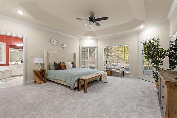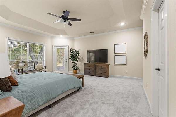 Looking for country living with all the space? Then take a look at this 4 bedroom, 3.5 bath, 3 car garage home nestled on 46 +-acres with a 40x60 workshop. Property is within minutes to two boat ramps to the Bois D' Arc Lake, has road frontage on 3 sides, is close to horse back riding trails and to government hunting land. The home has a covered front porch, a gas log fireplace, 2 living areas, 2 dining areas, a jack & Jill bath, a large primary bedroom, crown molding, tall ceilings, and a back patio with views of mature oak trees and a creek. Upstairs is the 4th ensuite bedroom and offers great space for guest or could be used as a home office. The 40X60 drive through-able, metal workshop has a concrete floor, electricity, 2 roll up doors, and has ample space for tractors, boats, hot rods or a large workshop.. The pasture is mostly open land that would be great for hay production, a garden area or for outdoor farm animals. To top it all off there is thick native timber around the creek area where deer have been spotted. Seller is willing to divide property.