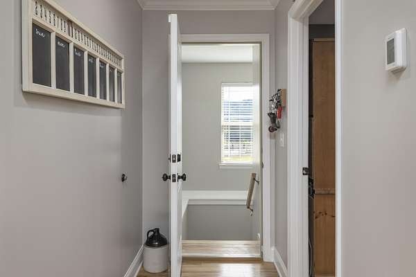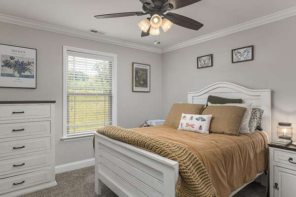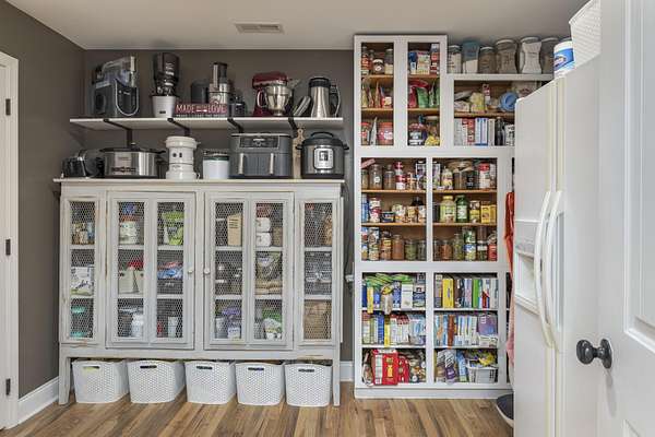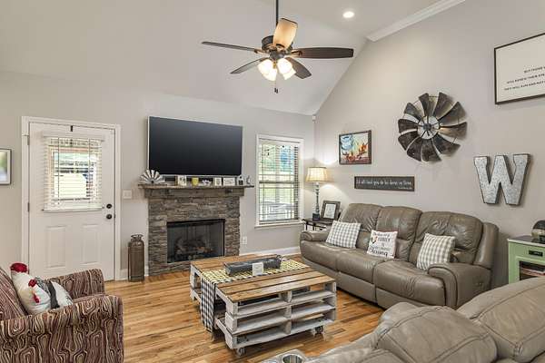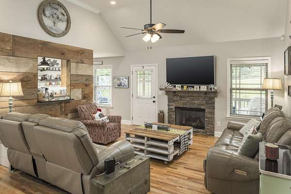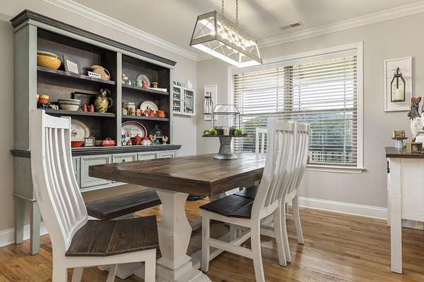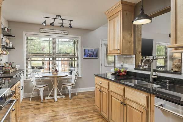 The main level features a great room with vaulted ceilings and a cozy gas fireplace, a formal dining room, and a gourmet kitchen with granite countertops, stainless GE Cafe appliances, breakfast area, freestanding coffee bar in kitchen to convey, plus a spacious walk-in pantry. A split-bedroom floor plan ensures privacy, with the primary suite overlooking the backyard. The primary bath offers double sinks, soaking tub, separate shower, and a generous walk-in closet. Additional highlights include a built-in storage laundry room, screened back porch off the kitchen and living room, and a beautiful Murphy bed that will remain in a secondary bedroom. Gorgeous wood floors flow throughout. Refrigerator in both kitchens and washer/dryer on both levels laundry to convey.