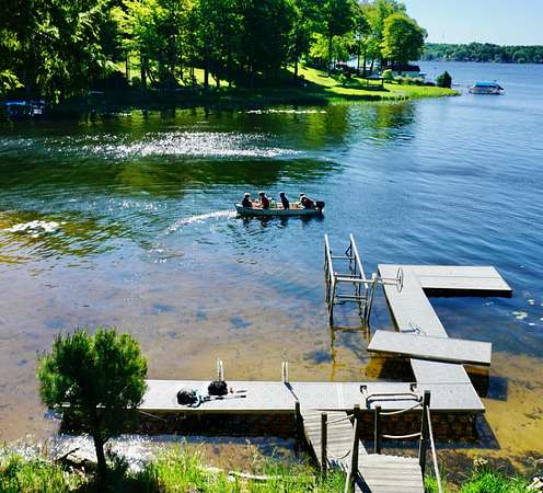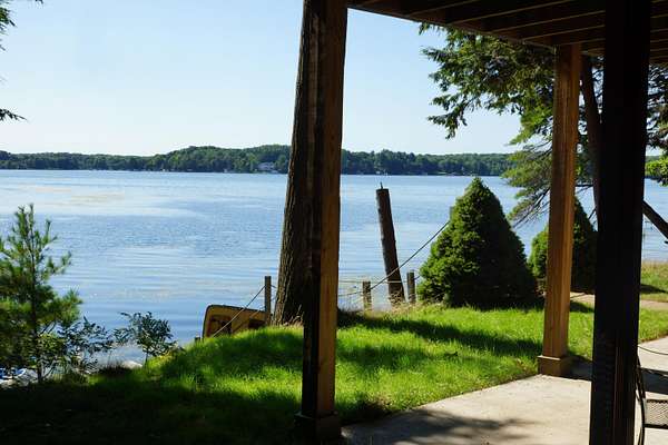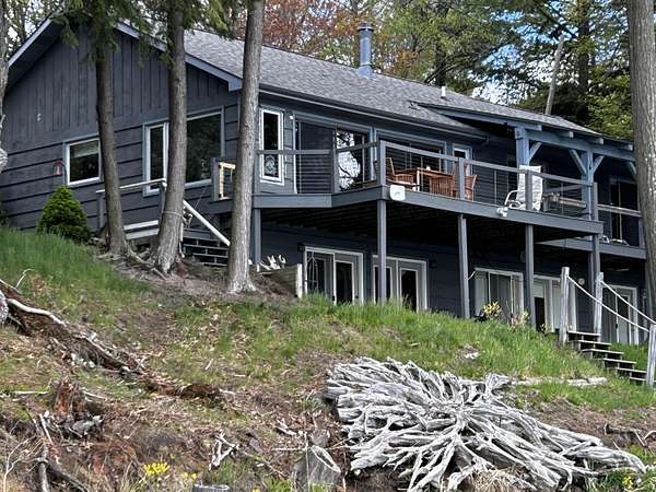 HAMLIN LAKE - 5.5+ acres - Welcome to an exceptional Hamlin Lake retreat, set on approximately 5.5 acres of serene woodland and shoreline - an incredibly rare opportunity to own expansive acreage on this highly sought-after lake. This stunning 5-bedroom, 3-bath home offers privacy, beautiful craftsmanship, and unforgettable panoramic water views from nearly every room. Step inside to an inviting open floor plan with vaulted ceilings and a striking living room fireplace framed by impressive stone masonry. Quality finishes are showcased throughout, including hardwood flooring in the living and dining areas, entryway, and bedrooms two and three. The spacious kitchen features tile flooring, a central island, pantry, and seamless flow to the dining and living rooms - perfect for gathering and entertaining. The primary suite offers a relaxing haven with soft carpeting and an ensuite bath featuring a shower unit and a remarkable soaking tub set in tile, positioned along lake-facing windows for breathtaking views and serene moments of escape. The main-level laundry/mud room provides ideal access to the attached 2-car garage. The finished walk out lower level expands the living and entertaining options with a generous recreation area, wet bar, two additional bedrooms, a full bath, and plenty of storage and flex space. Outdoors, a full-length covered deck overlooks Hamlin Lake, offering unobstructed views and a peaceful setting to watch the water change with the seasons. A large pole barn adds fantastic storage and utility. The long wooded drive, winding gently through the trees, creates a memorable approach to this private havenquiet and secluded, yet part of a welcoming lakeside community. This is a truly unique offering on Hamlin Lake: acreage, privacy, craftsmanship, and views that simply must be experienced to appreciate. Your lakefront luxury lifestyle begins here.