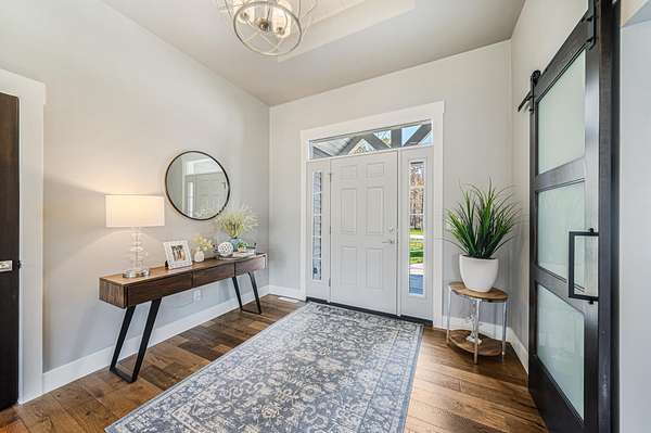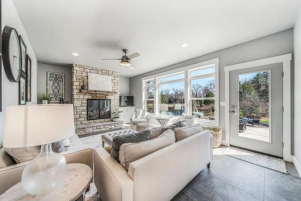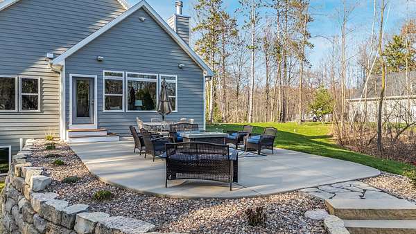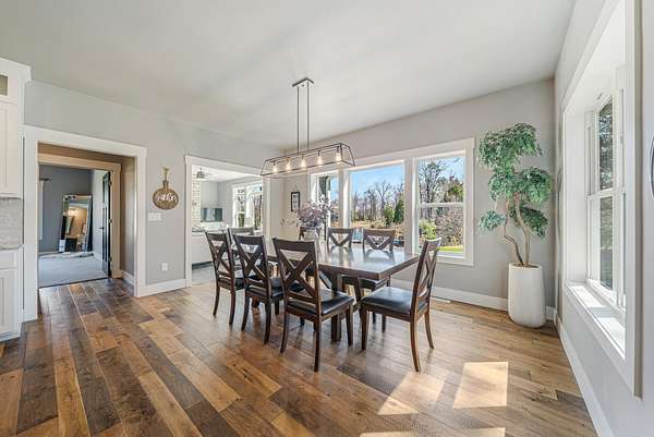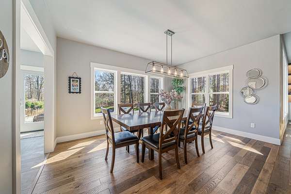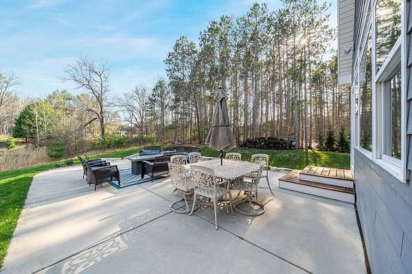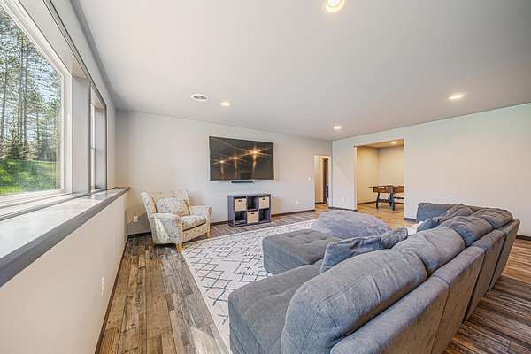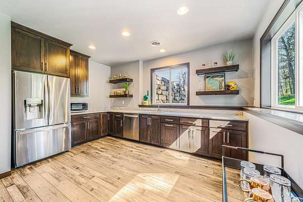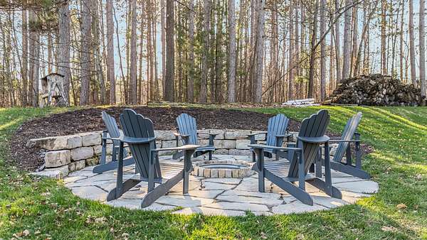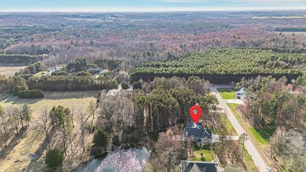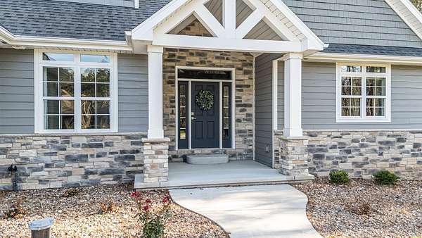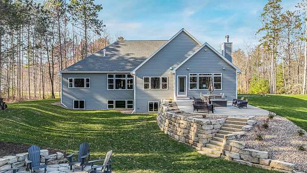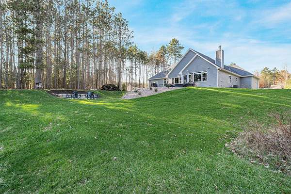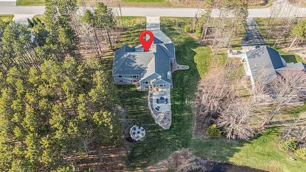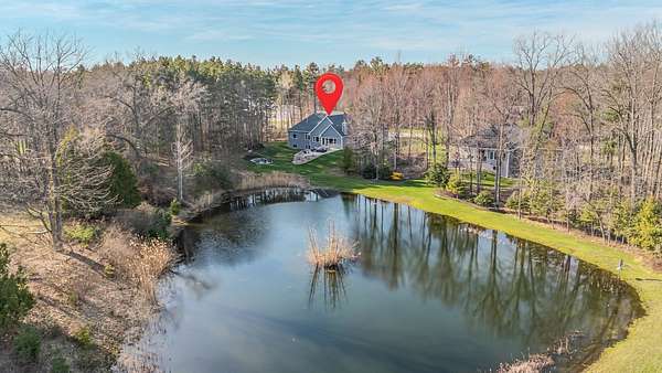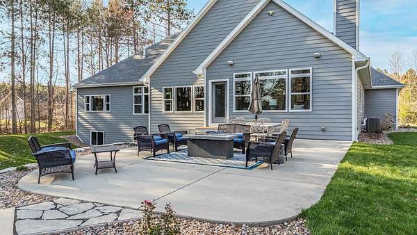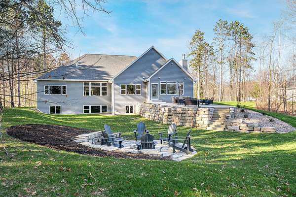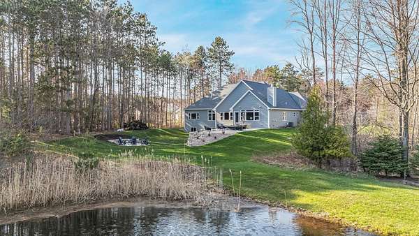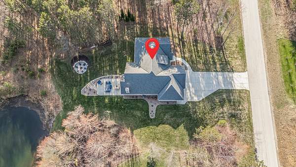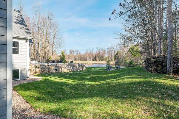 Gorgeous luxury home set on 1.5 acres in a peaceful rural setting. Enjoy your own backyard oasis featuring a scenic pond, patio, and firepit, perfect for relaxing or entertaining. The open concept main level offers a spacious living room, kitchen with a walk in pantry, and dining area. Just off the dining space, the hearth room showcases a wood burning fireplace and stunning backyard views. The lower level is designed for entertaining with a large rec room, wet bar, two bedrooms, and a full bathroom. The primary suite features an ensuite bathroom with a walk in shower, soaking tub, and a generous walk in closet. Two additional bedrooms and office space are located on the main level. The spacious laundry room off the mudroom adds everyday convenience. Smart Hardboard Siding.