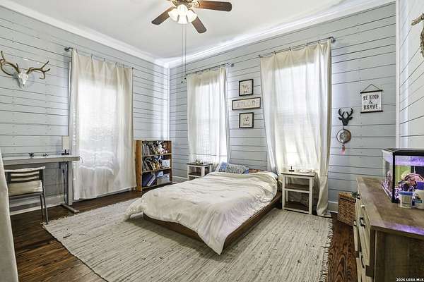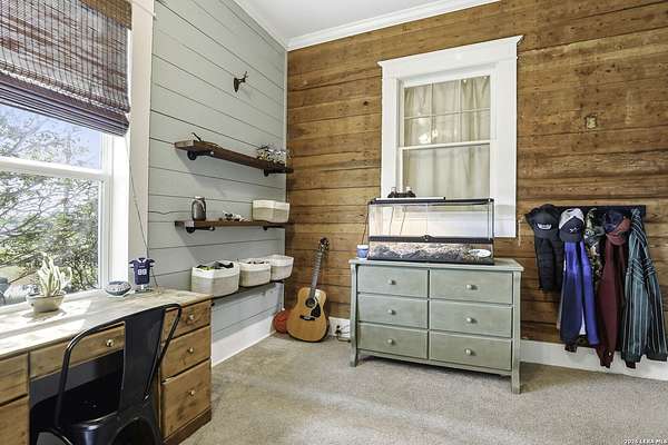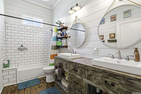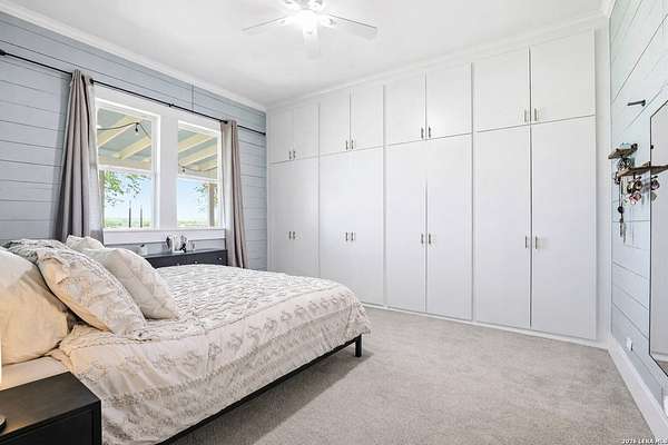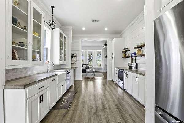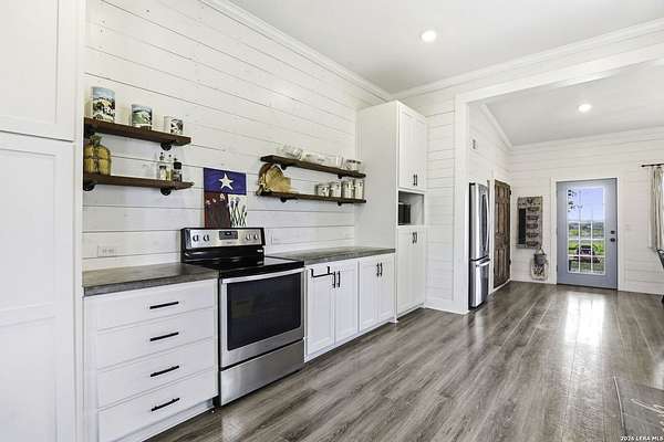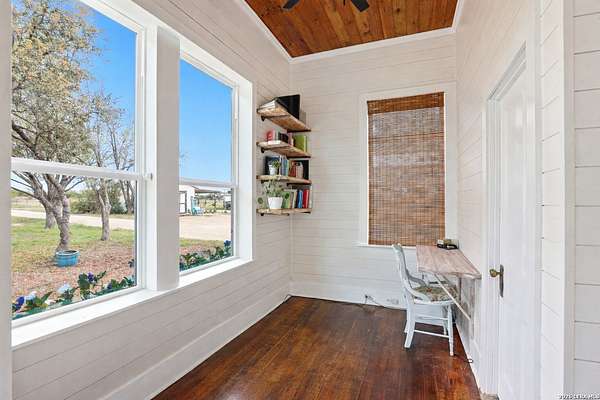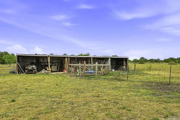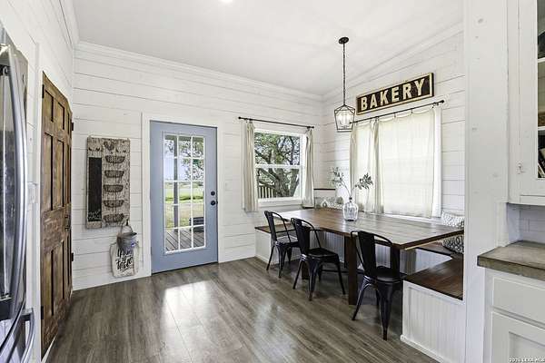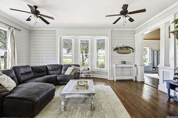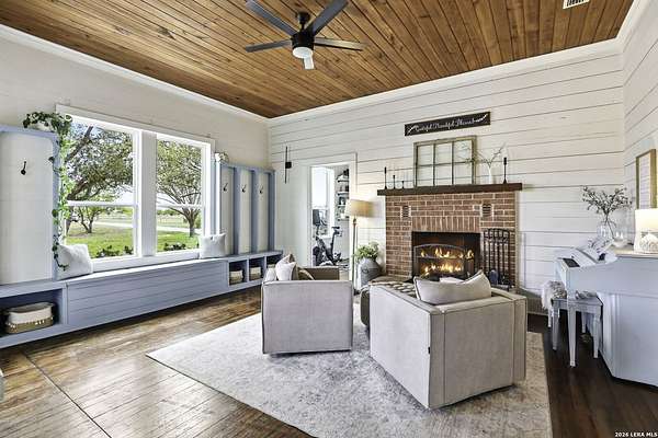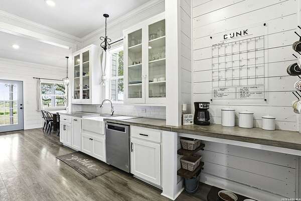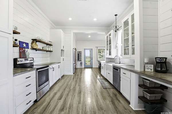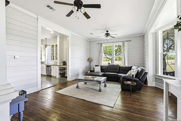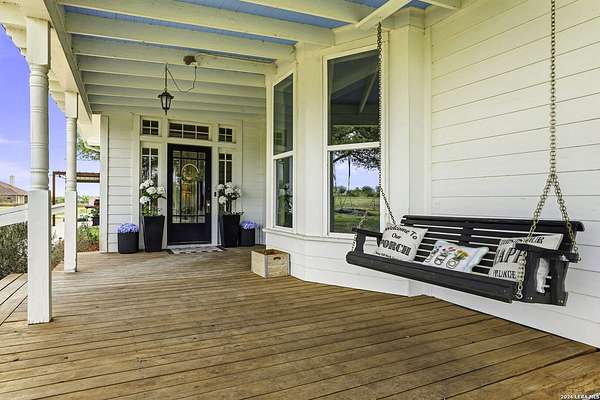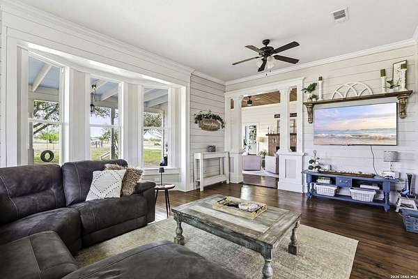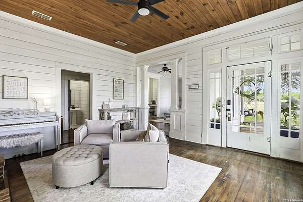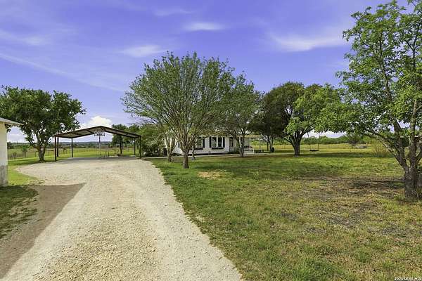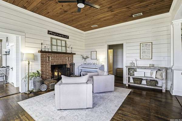Classic Hill Country elegance meets modern comfort in this beautifully renovated farmhouse set on 13.7 acres in Guadalupe County. This 4-bedroom, 2.5-bath residence blends timeless character with thoughtful updates, showcasing shiplap walls, original hardwood floors, warm wood-paneled ceilings, and a brick fireplace that anchors the inviting sitting room. The kitchen pairs style and function with a farmhouse sink, concrete-inspired countertops, and open shelving-creating a clean, elevated aesthetic ideal for both everyday living and entertaining. Life here extends beyond the walls. Start your mornings on the covered front porch swing, host gatherings beneath the expansive pavilion, or enjoy wide-open pasture framed by mature trees and endless Texas skies. Whether you envision peaceful country mornings, outdoor recreation, or space for hobbies and animals, this property offers unmatched versatility. Located within highly regarded Navarro ISD and just minutes from San Marcos and New Braunfels, this home delivers refined country living with convenience, charm, and room to breathe.
