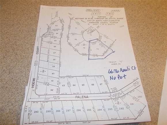 Est $207/moVACANT LAND in the sought after Gated Community of Holiday Park and NOT IN THE PET SECTION. The land is located on Hauli Court, in the cul-de-sac and is 6921 square feet. It sits between 2 new homes. In Holiday Park you own the land with a deed and the maintenance fee $2340.00 a year ($195.00 a month) is included in your taxes. Holiday Park offer many amenities including 2 Pools, Tennis Courts, Pickle Ball, Bocci, Shuffleboard, Laundry Library, Horseshoes, Bingo plus other card games, Fitness Room and so much more. This home has been pulled off and electric and water are in place. This is a perfect place for your new manufactured home. Come and see!