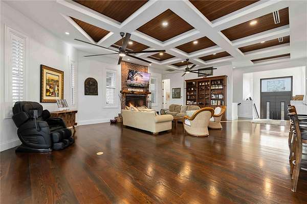 - Ceiling Fans(s), Coffered Ceiling(s), Eat-In Kitchen, Elevator, High Ceilings, Kitchen/Family Room Combo, Open Floorplan, Primary Bedroom Main Floor, Solid Surface Counters, Solid Wood Cabinets, Stone Counters, Thermostat, Tray Ceiling(s), Walk-In Closet(s), Window Treatments