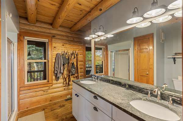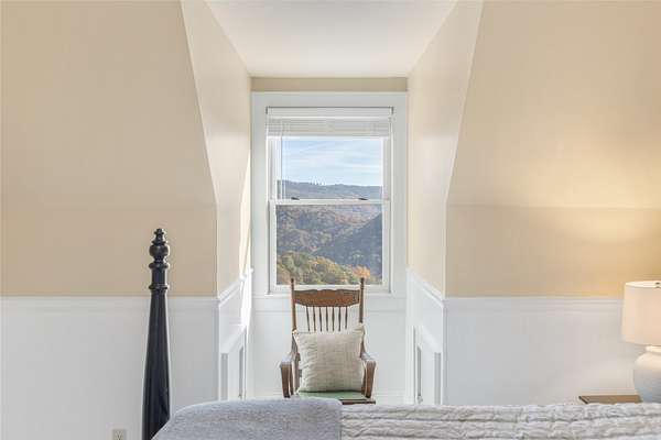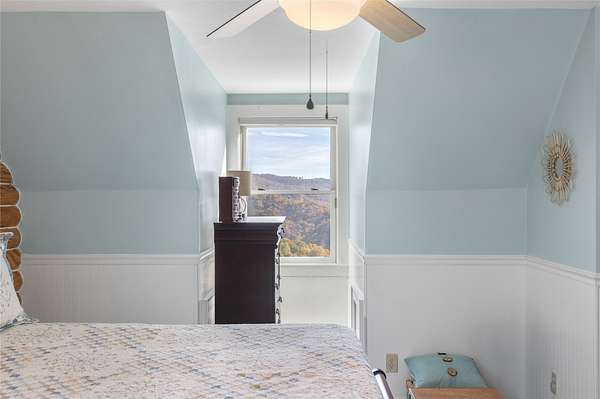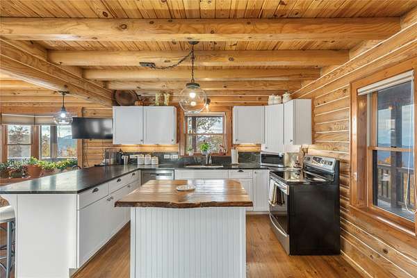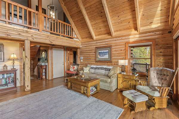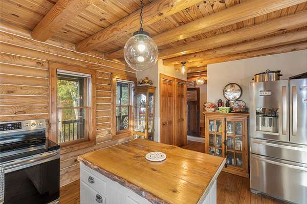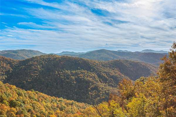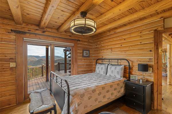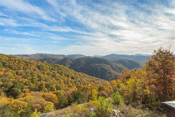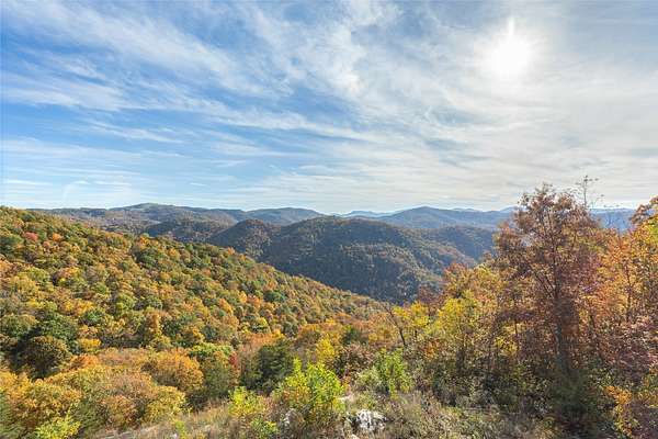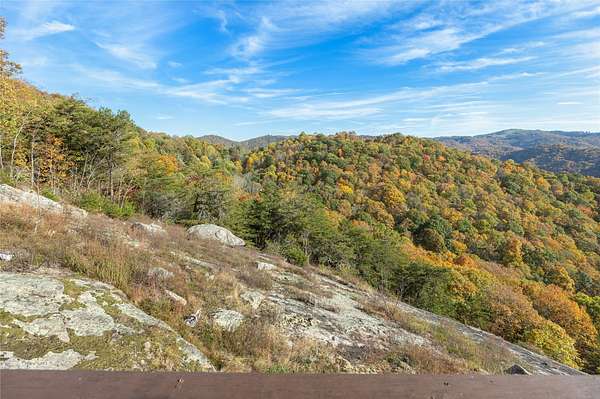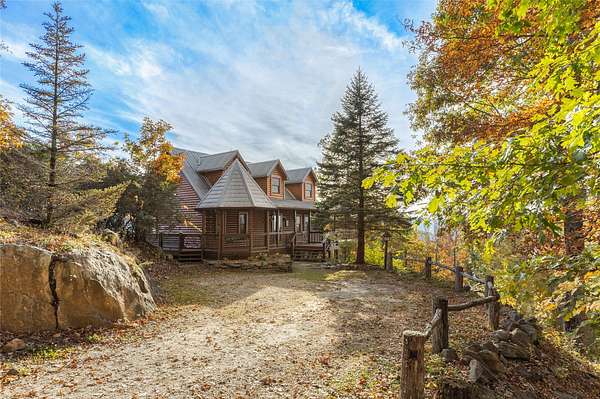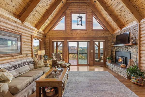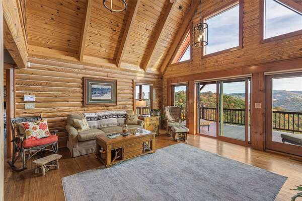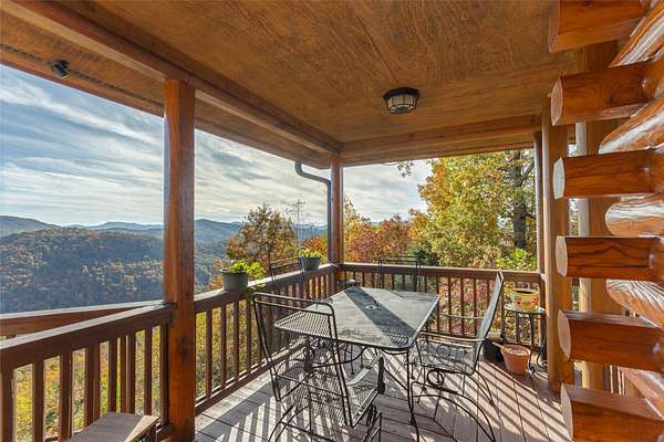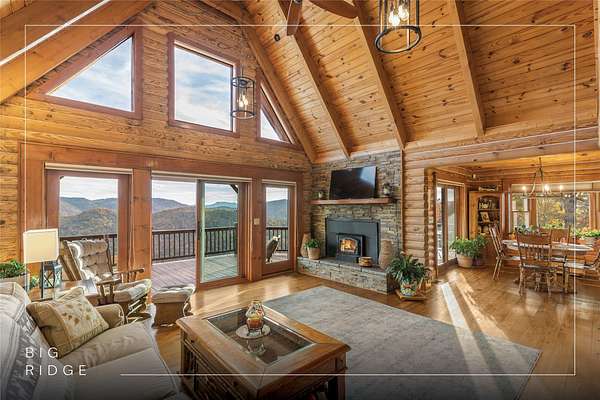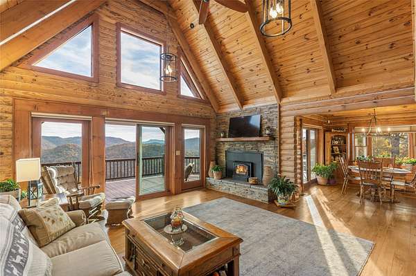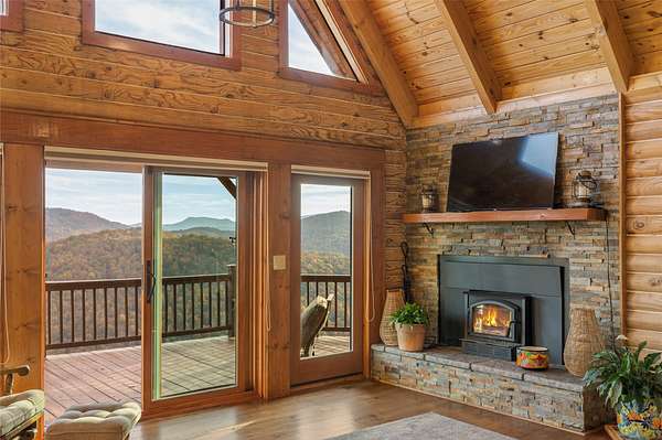 Perched above 4,000 feet on more than 11 secluded acres, this log home in Glenville's Big Ridge area offers a front-row seat to nature's ever-changing beauty. Each season brings its own show with spring wildflowers and the return of songbirds, lush green canopies and cool mountain breezes in summer, brilliant foliage in autumn, and peaceful, snow-dusted stillness in winter. The western skies deliver unforgettable sunsets from the wraparound deck, painting the surrounding mountains in a vibrant array of shifting colors each evening. Crafted with timeless log construction, the home's warm, inviting interiors frame sweeping, year-round long- and short-range mountain views, with a dramatic rock face nearby. The living area features soaring cathedral ceilings, abundant windows that flood the space with natural light, and a wood-burning fireplace for cozy nights by the fire. The farmhouse kitchen - with its electric range, center island, breakfast bar, and rich soapstone countertops - balances rustic charm with everyday functionality and opens to an adjacent dining area ideal for gatherings. The main-level primary suite offers direct deck access, a walk-in closet, a sliding barn door, and tranquil mountain vistas, offering a peaceful retreat at day's end and an inspiring view to wake up to each morning. Upstairs, two spacious guest bedrooms and a full bathroom provide comfort and privacy for family and visitors. The wraparound covered deck and front porch invite effortless outdoor living, perfect for sipping morning coffee, reading in warm sunlight, or simply taking in the ridgeline views. Landscaped grounds feature stone walls, a boulder rock garden, and trails that meander through native flora, enhancing the property's natural beauty and sense of solitude. As evening falls, gather around the fire pit beneath a canopy of stars and feel entirely at peace in the stillness of the mountains. Additional features include refinished wood floors throughout, a basement garage with a half bathroom, laundry, and ample storage, as well as a generator for added peace of mind. Conveniently located just a short drive from Lake Glenville, Happ's Place, and The Local, and about 30 minutes from downtown Cashiers, this quintessential mountain retreat captures the rhythm of the seasons and the pure art of sunset living in the Blue Ridge Mountains.