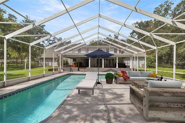 Under contract-accepting backup offers. One or more photo(s) has been virtually staged. Welcome to a true sanctuary of sophistication and serenity, nestled within the prestigious gated community of Summit II in Southwest Ocala. This extraordinary 2.5-acre estate blends elegance with privacy, beginning with its own private gated entrance that sets the tone for exclusivity from the moment you arrive. Spanning nearly 3,800 square feet of thoughtfully designed living space, the residence offers four spacious bedrooms, four and a half luxurious baths, a dedicated office, and both formal and casual living areas--perfectly curated for both intimate evenings and grand entertaining. The remodeled kitchen is a culinary masterpiece, showcasing gleaming stainless-steel appliances, a farmhouse sink, a generous center island, and modern finishes that inspire gourmet creations. A custom bar with wine cooler elevates the dining experience, while the remodeled primary bath provides a spa-inspired retreat designed for ultimate relaxation. An expansive family room anchored by a fireplace invites cozy gatherings, while the outdoor oasis rivals a luxury resort. A sparkling saltwater pool with hot tub, complemented by a screened enclosure, invites effortless year-round enjoyment. The park-like grounds, enhanced with an oversized driveway, 3 car garage, and pre-wired shed, ensure both beauty and practicality. This A1-zoned property offers not only refined living but also peace of mind, with newer appliances, updated air conditioning, and countless thoughtful upgrades throughout. Situated just minutes from fine dining, equestrian venues, and the cultural treasures of Southwest Ocala, this estate harmonizes convenience with privacy. Indulge in the rare opportunity to own a residence that embodies timeless luxury, modern comfort, and enduring value.