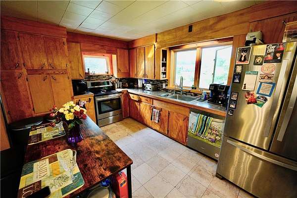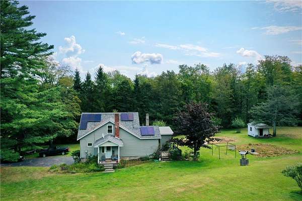 Welcome to the Shandelee Mountain House - a rare chance to claim your own slice of the Catskills on 8.25 acres, just minutes from the ever-popular hamlet of Livingston Manor. This 3-bedroom, 2.5-bath home blends solid bones with an open invitation for the next owner to bring fresh style and modern touches. Perched along a peaceful, winding mountain road, the property greets you with a gently rolling, open yard dotted with pear and apple trees, a garden shed, and a workshop/garage complete with wood-burning stove and workbenches. Out back, a deck offers the perfect perch for morning coffee or sunset grilling, overlooking what could become a thriving garden once again. The rear acreage is wooded and relatively flat - ideal for creating trails, outdoor play spaces, or a private retreat in nature. Recent upgrades include a newer roof and siding, plus a large leased solar array with transferrable terms for eco-minded buyers. Inside, the kitchen features custom cabinetry, a tiled accent wall, and stainless steel appliances. The main-floor primary bedroom is generous in size, while upstairs offers two more large bedrooms and a full bath. The lower level adds a whole other dimension - a retro brick wall with built-in wood-burning stove, vintage wood-fired oven, and even an indoor grill with hood. There's also a half bath, laundry room, and a dedicated storage space with shelves. If you've been waiting for the right property to enter the Livingston Manor market, this is it: plenty of acreage, a strong structure, and endless potential to make it completely your own. Bring your ideas, your vision, and maybe a few friends for the weekend - the Shandelee Mountain House is ready for its next chapter. This is your chance to get into Livingston Manor with vision and creativity-transforming a solid, well-located home into your perfect Catskills retreat.
