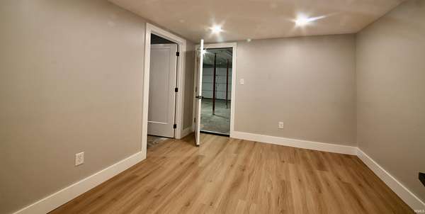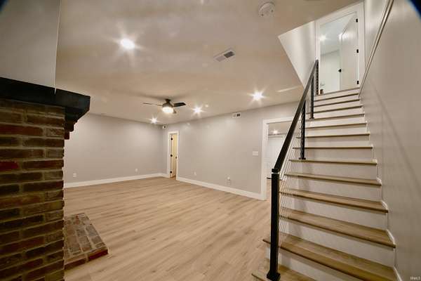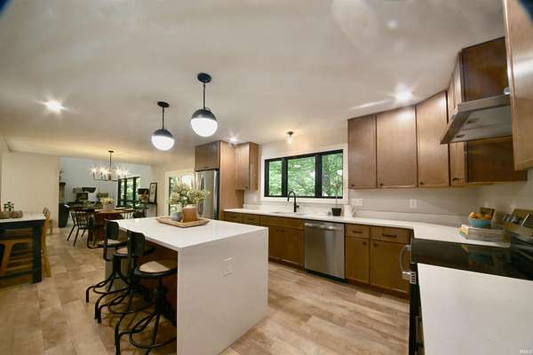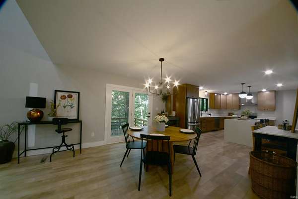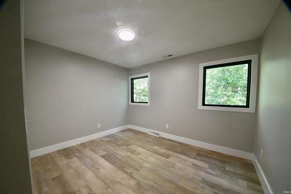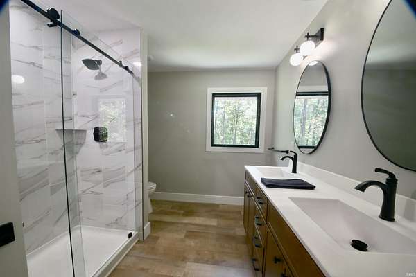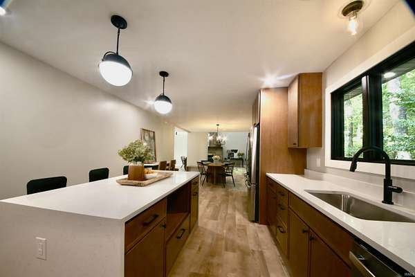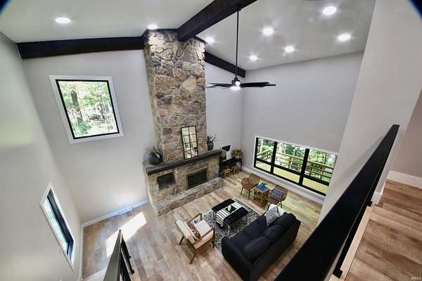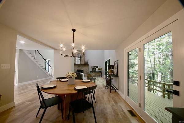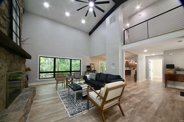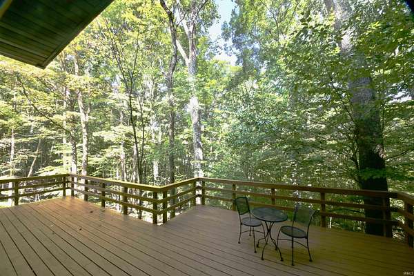 Modern 1.5-Story Home on 2 Wooded Acres on the East side of Bloomington and Near Lake Monroe Discover this beautifully designed modern home set on a serene 2-acre wooded lot on Bloomington's East side, just minutes from Lake Monroe. With a contemporary style, spacious layout, and natural surroundings, this property offers both comfort and privacy. Main Level - Welcoming entry foyer - Bright living room with soaring ceilings, fireplace, and expansive windows overlooking the trees - Dining area with direct access to a large deck, perfect for entertaining - Modern kitchen featuring an island and sleek finishes - Private office with large window and natural light - Convenient half bath Upper Level - Primary suite with private bath and two closets - Two additional bedrooms - Full bathroom Basement - Spacious family room with fireplace - Half bath - Utility and mechanical rooms - 2-car garage with basement access Enjoy peaceful wooded views from every level while being close to shopping, schools, and outdoor recreation at Lake Monroe. This home combines modern design with a tranquil setting, making it a rare find on Bloomington's East side.