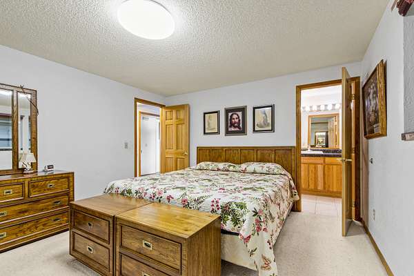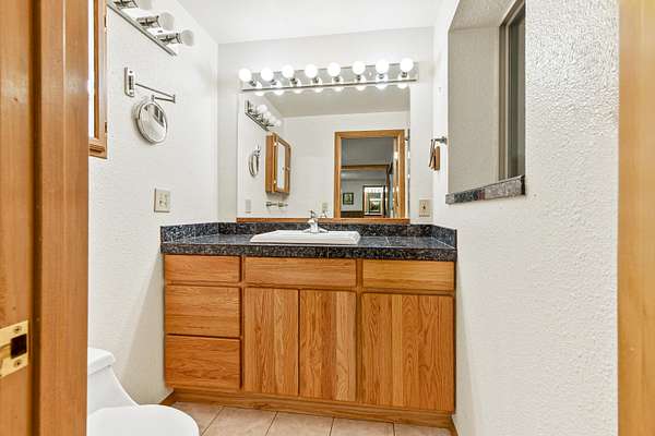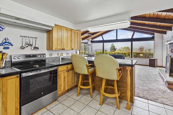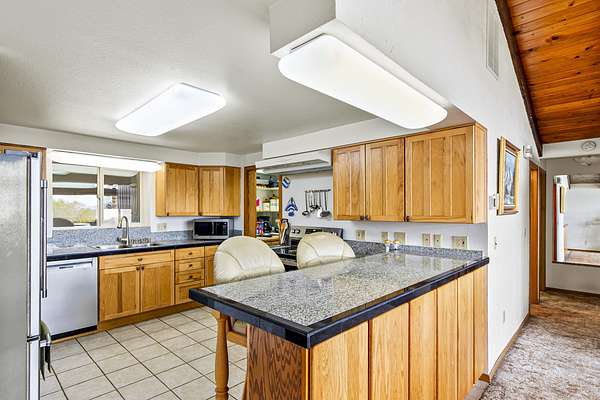 - Breakfast Bar, Granite Counters, Linen Closet, Open Floorplan, Pantry, Primary Downstairs, Shower/Tub Combo, Tile Counters, Vaulted Ceiling(s), Wired For Sound